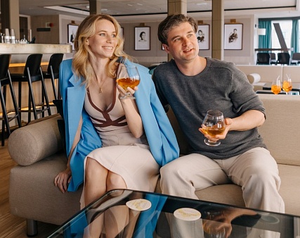 - Ужин — заказная система питания (выбор блюд со 2-го дня круиза), фиксированная рассадка. Включённые напитки (без ограничения): вода, чай, кофе, домашний морс. На выбор: вино красное / белое / игристое (1 бокал, 125 мл) / водка (1 рюмка 50 мл) / пиво (1 бокал, 300 мл).