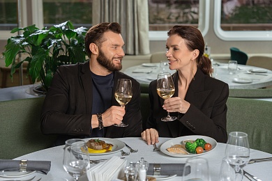 - Ужин — заказная система питания (выбор блюд со 2-го дня круиза), фиксированная рассадка. Включённые напитки (без ограничения): вода, чай, кофе, домашний морс. На выбор: вино красное / белое / игристое (1 бокал, 125 мл) / водка (1 рюмка 50 мл) / пиво (1 бокал, 300 мл).