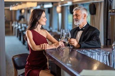 - Ужин — заказная система питания (выбор блюд со 2-го дня круиза), фиксированная рассадка. Включённые напитки (без ограничения): вода, чай, кофе, домашний морс. На выбор: вино красное / белое / игристое (1 бокал, 125 мл) / водка (1 рюмка 50 мл) / пиво (1 бокал, 300 мл).