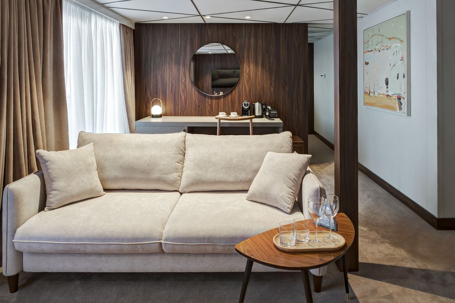 В каюте: двуспальная кровать (раздвигается), диван, панорамные окна, спутниковое ТВ, шкаф для одежды, холодильник, кондиционер, розетки 220V, телефон, радио, фен, капсульная кофемашина, электрочайник, сейф, ванна или душ, санузел. Площадь — до 37 м2.