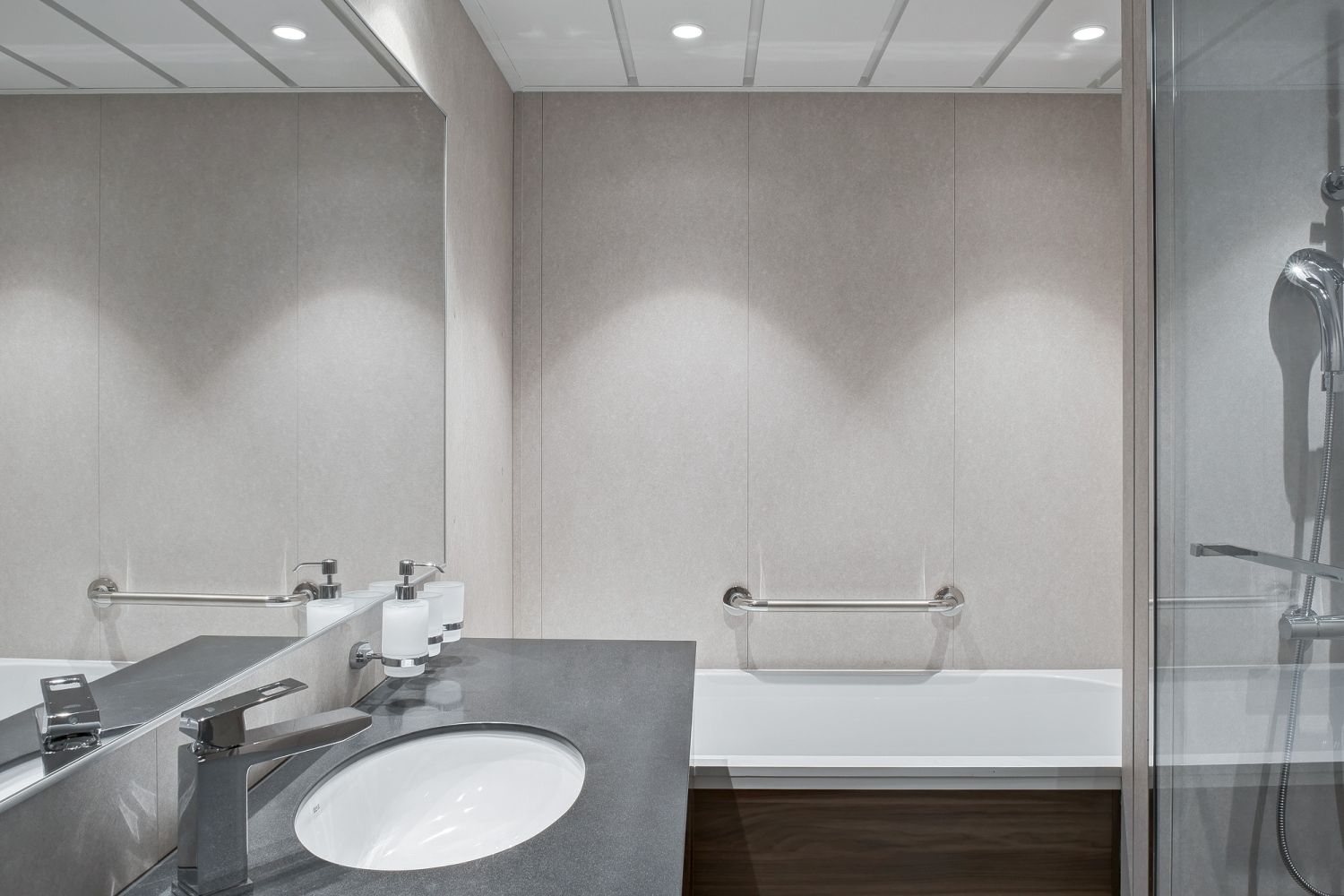 В каюте: двуспальная кровать (раздвигается), диван, панорамные окна, балкон, спутниковое ТВ, шкаф для одежды, холодильник, кондиционер, розетки 220V, телефон, радио, фен, капсульная кофемашина, электрочайник, cейф, душ, ванна, санузел. Площадь — 46 м2. (площадь балкона — 10 м2.)
