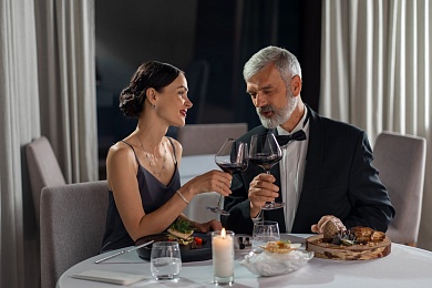 - Ужин — заказная система питания (выбор блюд со 2-го дня круиза), фиксированная рассадка. Включённые напитки (без ограничения): вода, чай, кофе, домашний морс. На выбор: вино красное / белое / игристое (1 бокал, 125 мл) / водка (1 рюмка 50 мл) / пиво (1 бокал, 300 мл).