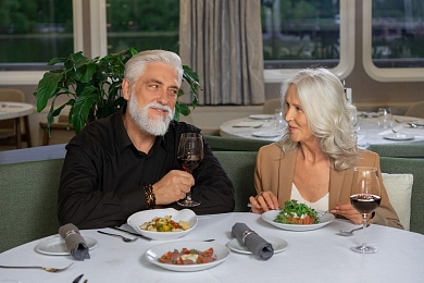 - Ужин — заказная система питания (выбор блюд со 2-го дня круиза), фиксированная рассадка. Включённые напитки (без ограничения): вода, чай, кофе, домашний морс. На выбор: вино красное / белое / игристое (1 бокал, 125 мл) / водка (1 рюмка 50 мл) / пиво (1 бокал, 300 мл).