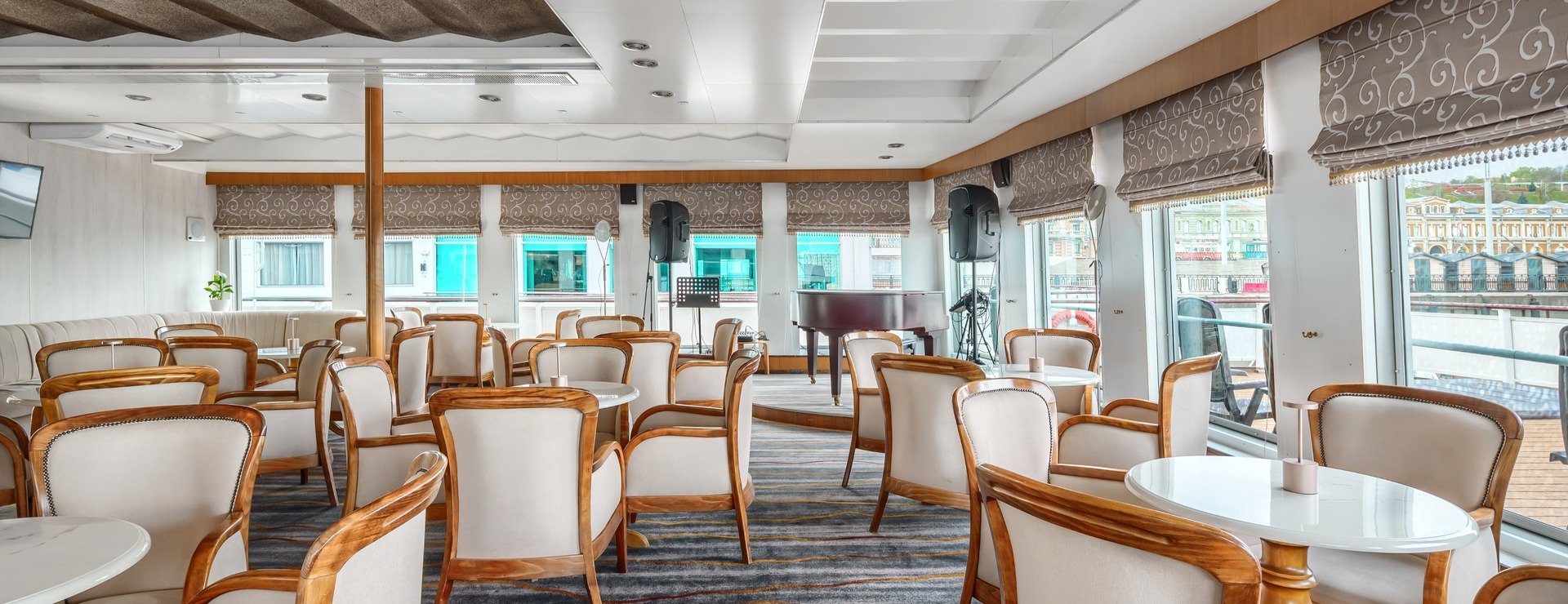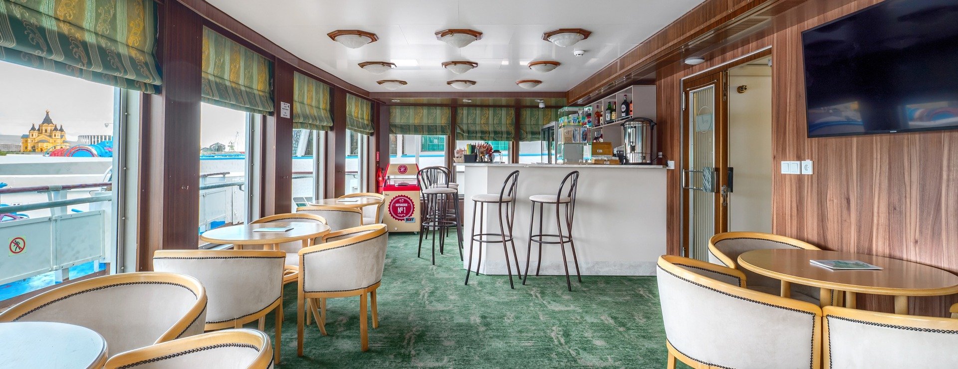 В каюте: одно спальное место, шкаф для одежды, радио, телевизор, холодильник, сейф, душ, санузел, фен, кондиционер, обзорное окно, электророзетка на 220V.