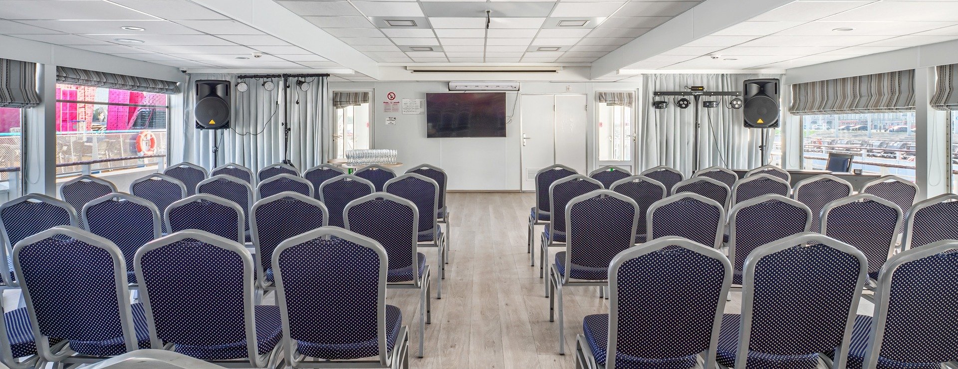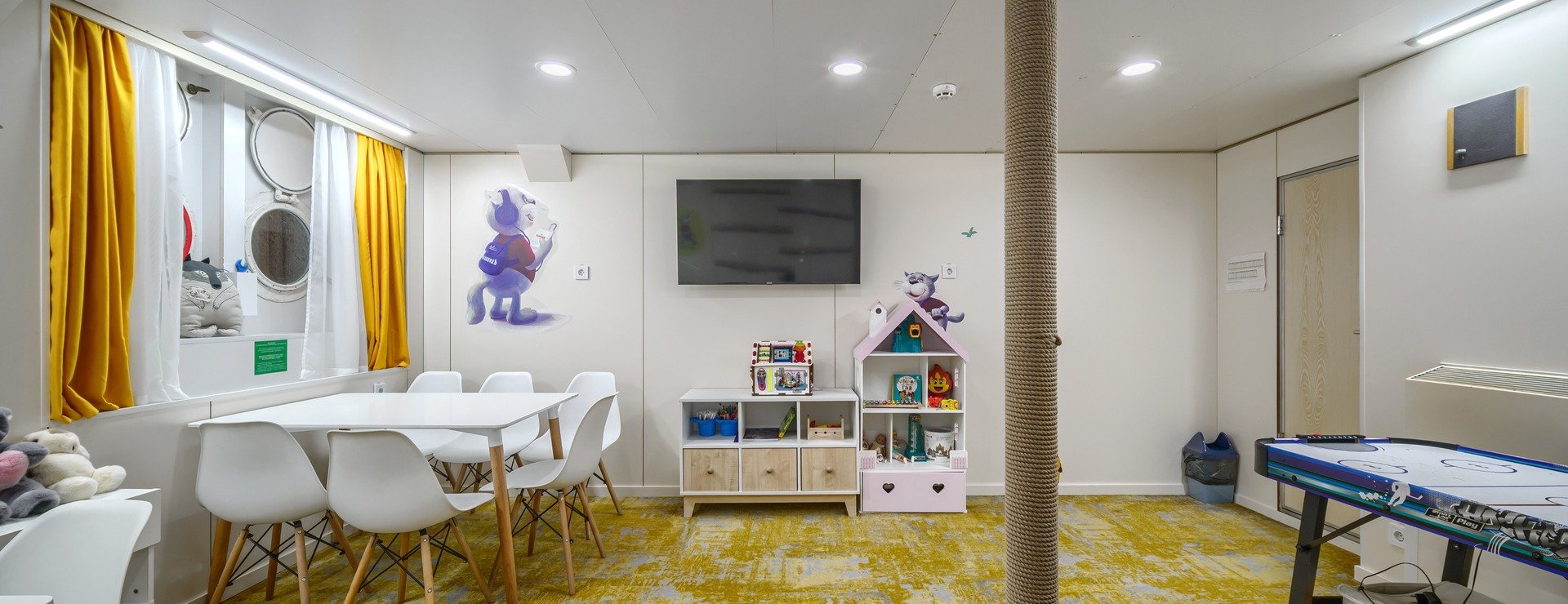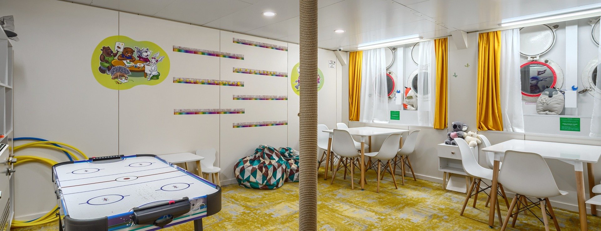 В каюте: три спальных места (два внизу, одно — вторым ярусом), шкаф для одежды, трюмо, радио, телевизор, фен, холодильник, сейф, два иллюминатора, электророзетка на 220V.