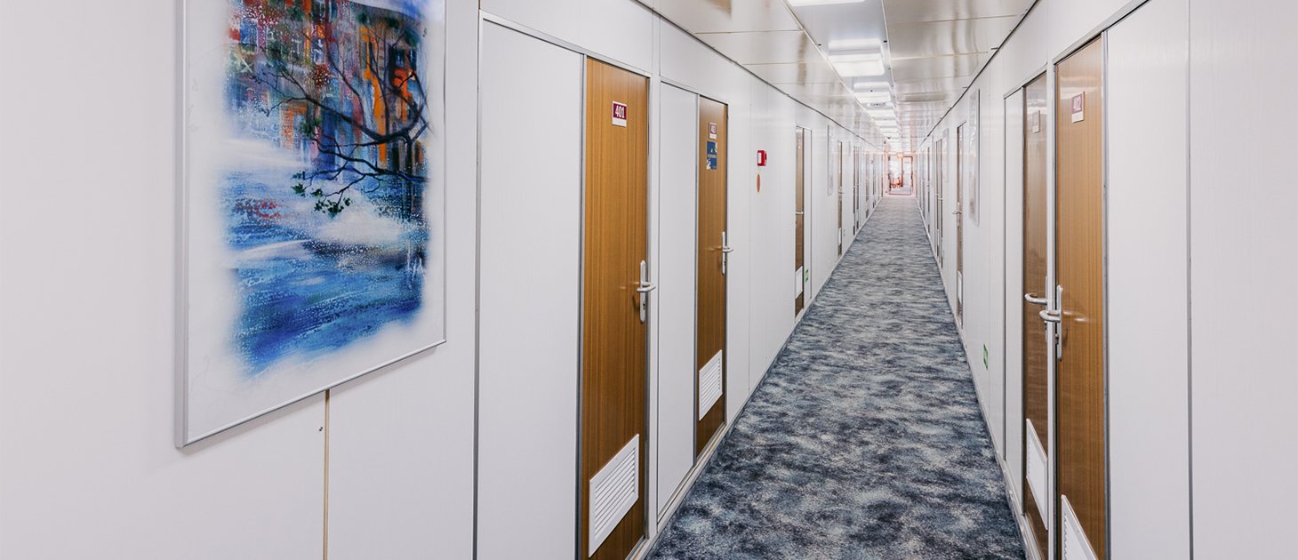 В каюте: кровать, шкаф для одежды, трюмо, телевизор, холодильник, сейф, радио, фен, одно обзорное окно, электророзетка на 220V. Две односпальные кровати размером 80х190 см, площадь каюты 13,2 м2.