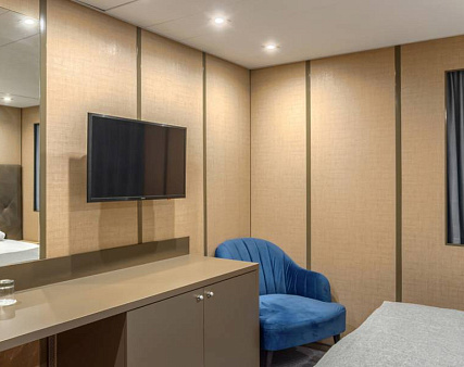 В каюте: двуспальная кровать, диван, кресло, шкаф для одежды, журнальный стол, телевизор, холодильник, фен, радио, сейф, четыре обзорных окна, электророзетка на 220V.