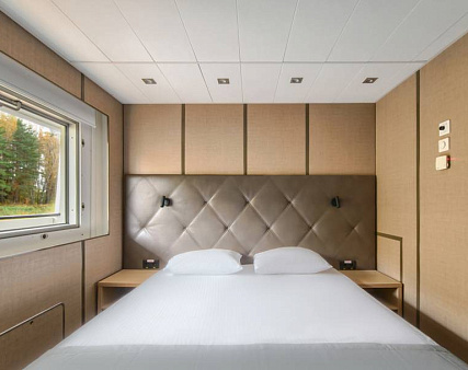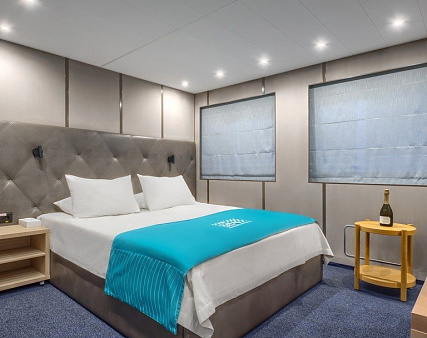 В каютах 403, 405-409, 412, 414, 419-422 (шлюпочная палуба), 323-334, 341-344 (средняя палуба) — двуспальная кровать размером 160х200 см, площадь каюты 15,5 м2