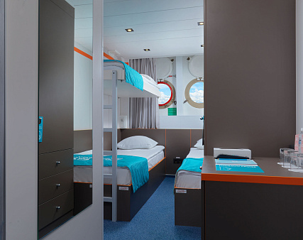 В каютах 401, 402, 404, 410, 411, 431-434 (шлюпочная палуба), 319-322, 339, 340, 345, 346, 365, 366, 369, 370 (средняя палуба) — две односпальные кровати размером 80х180 см, площадь каюты 10 м2