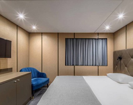 В каюте: двуспальная кровать, диван, кресло, шкаф для одежды, журнальный стол, телевизор, холодильник, фен, радио, сейф, четыре обзорных окна, электророзетка на 220V.