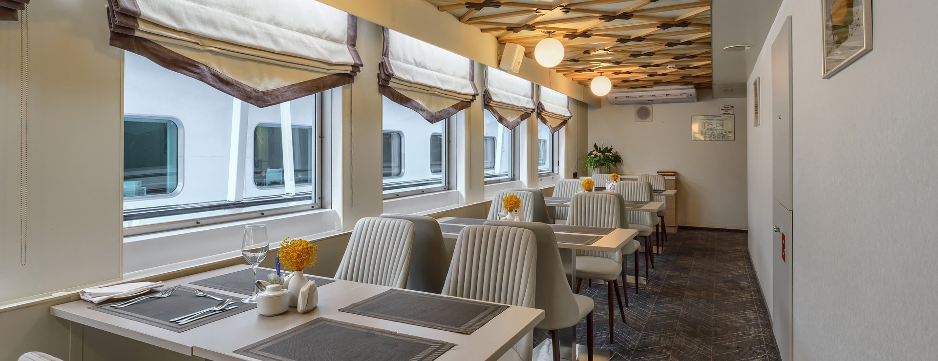 - Ужин – заказная система питания (выбор блюд со 2-го дня круиза) с элементами шведского стола (салат-бар, хлебная станция, фрукты). Включенные напитки (без ограничения): вода, чай, кофе. Кисломолочный напиток (1 стакан, 200 мл.) по запросу гостя. На выбор: вино красное / белое / игристое (1 бокал, 125 мл.) / водка (1 рюмка, 50 мл.) / пиво (1 бокал, 300 мл.) / домашний морс (1 бокал, 200 мл.). Фиксированная рассадка;