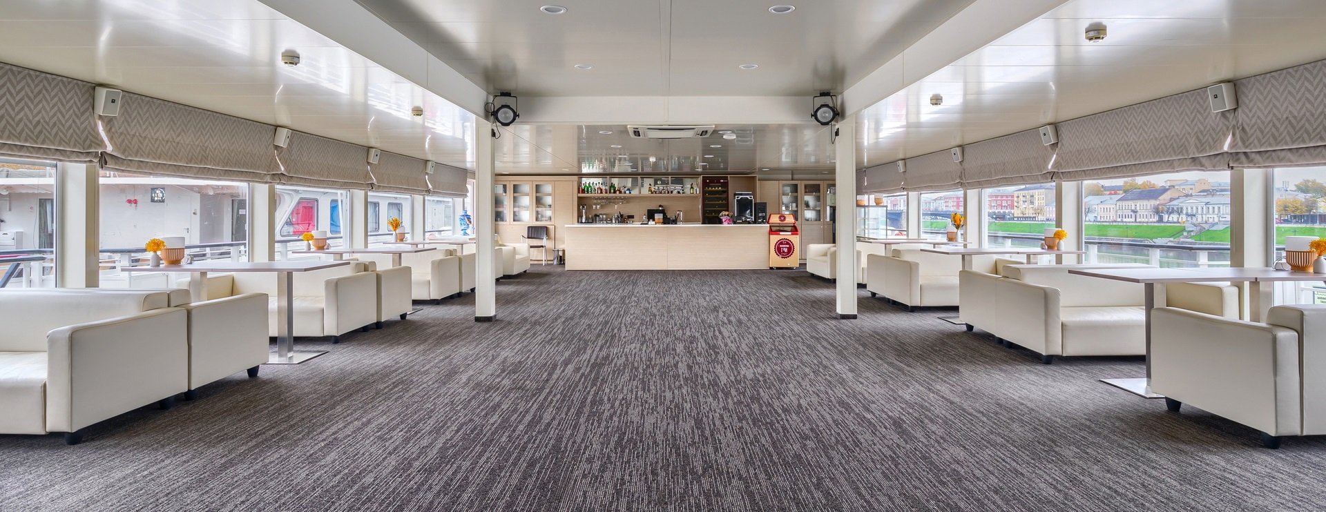 В каюте: двуспальная кровать, диван, кресло, шкаф для одежды, журнальный стол, телевизор, холодильник, фен, радио, сейф, четыре обзорных окна, электророзетка на 220V.