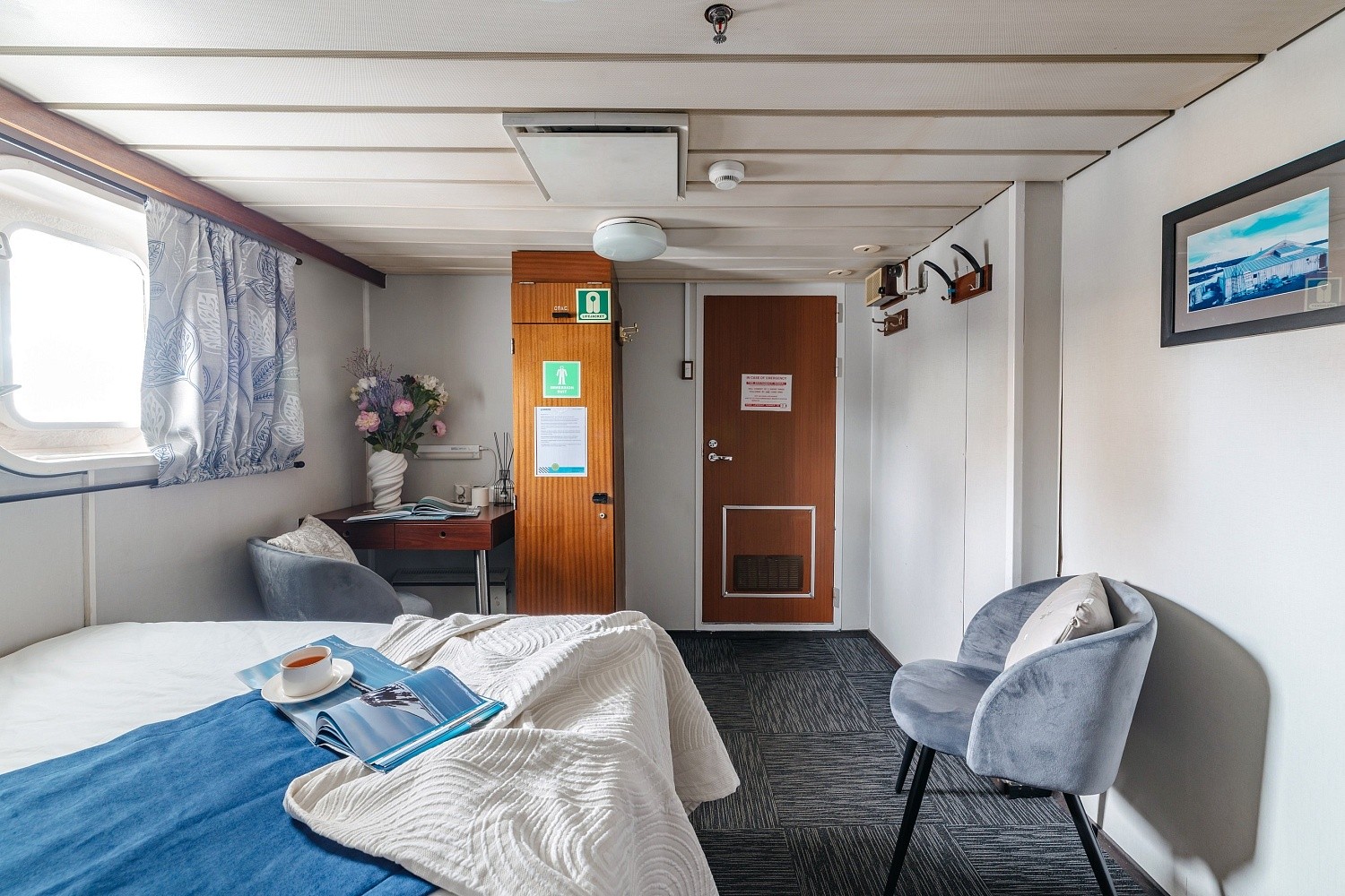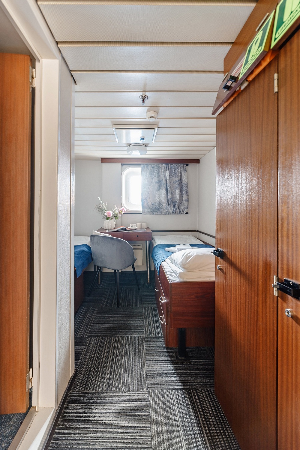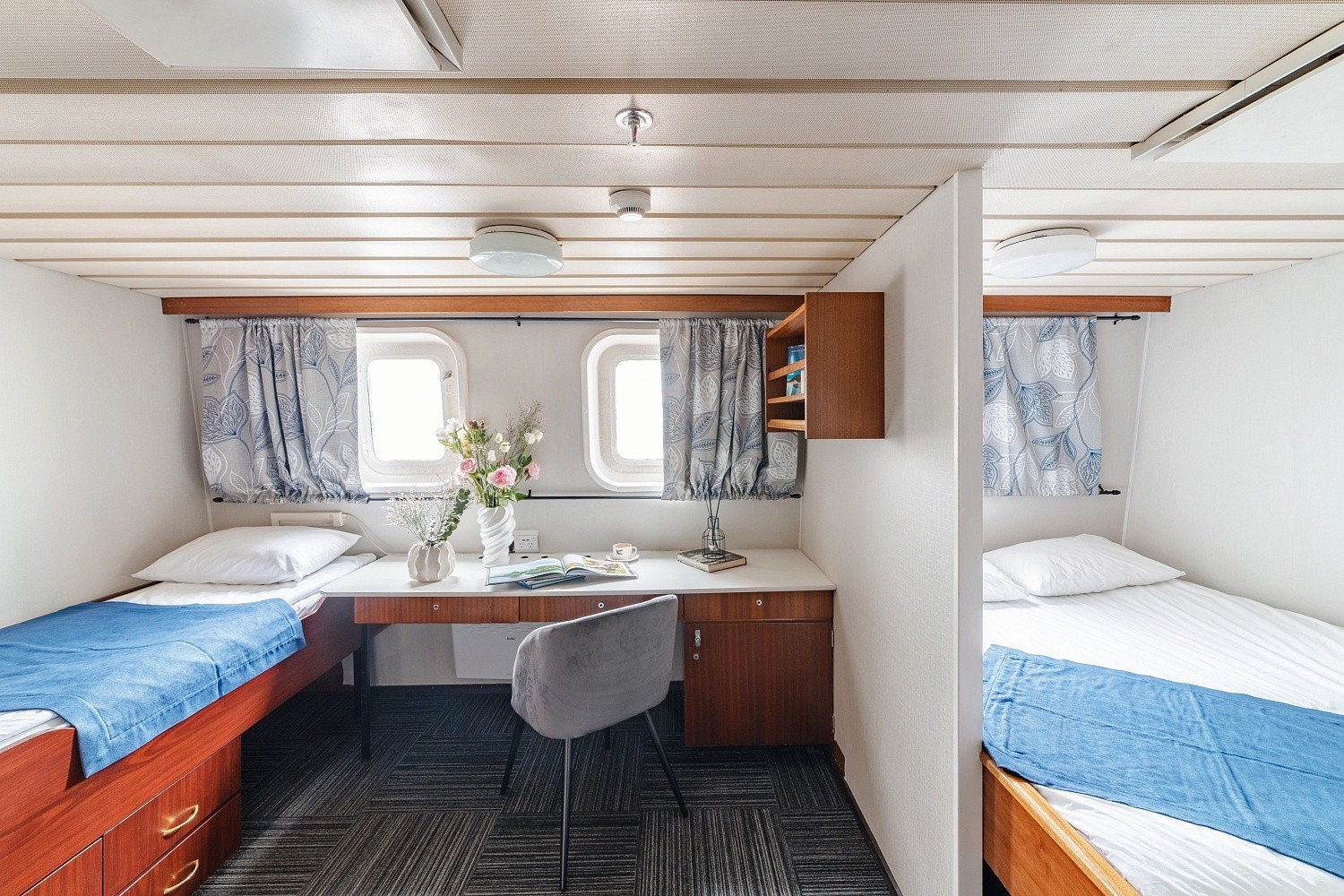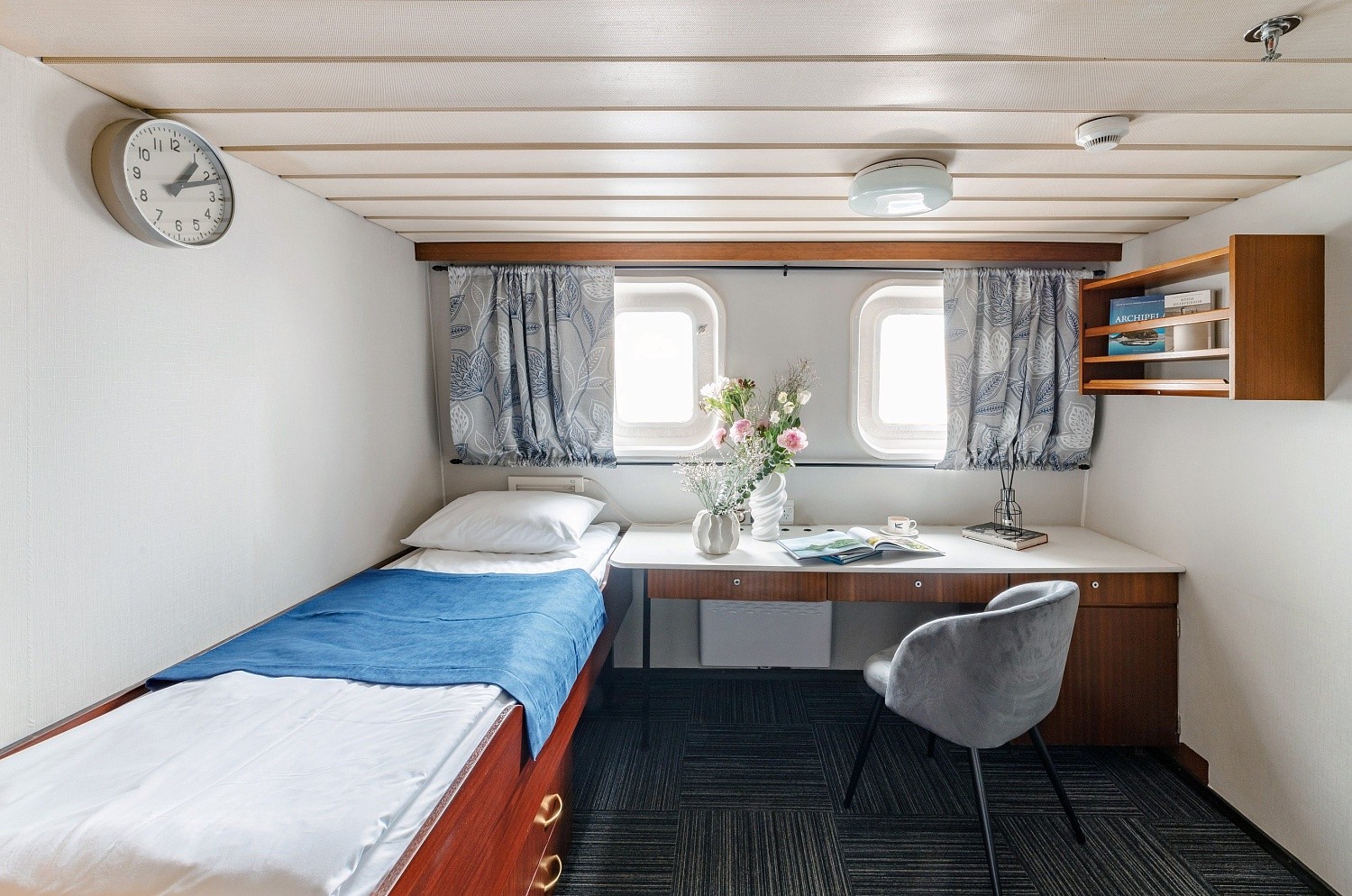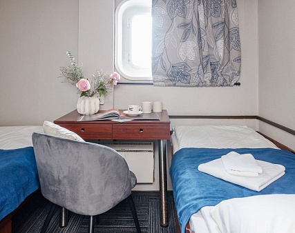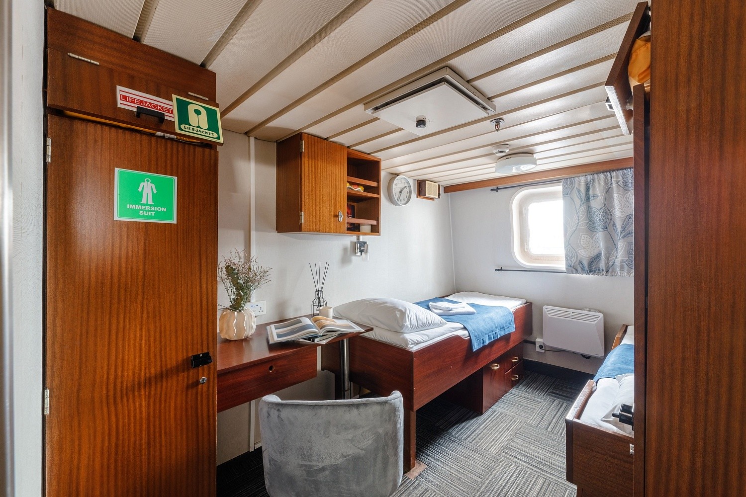В каюте: окно, два спальных места (нижние), письменный стол, шкаф, тумбочки и собственные туалет и душ.