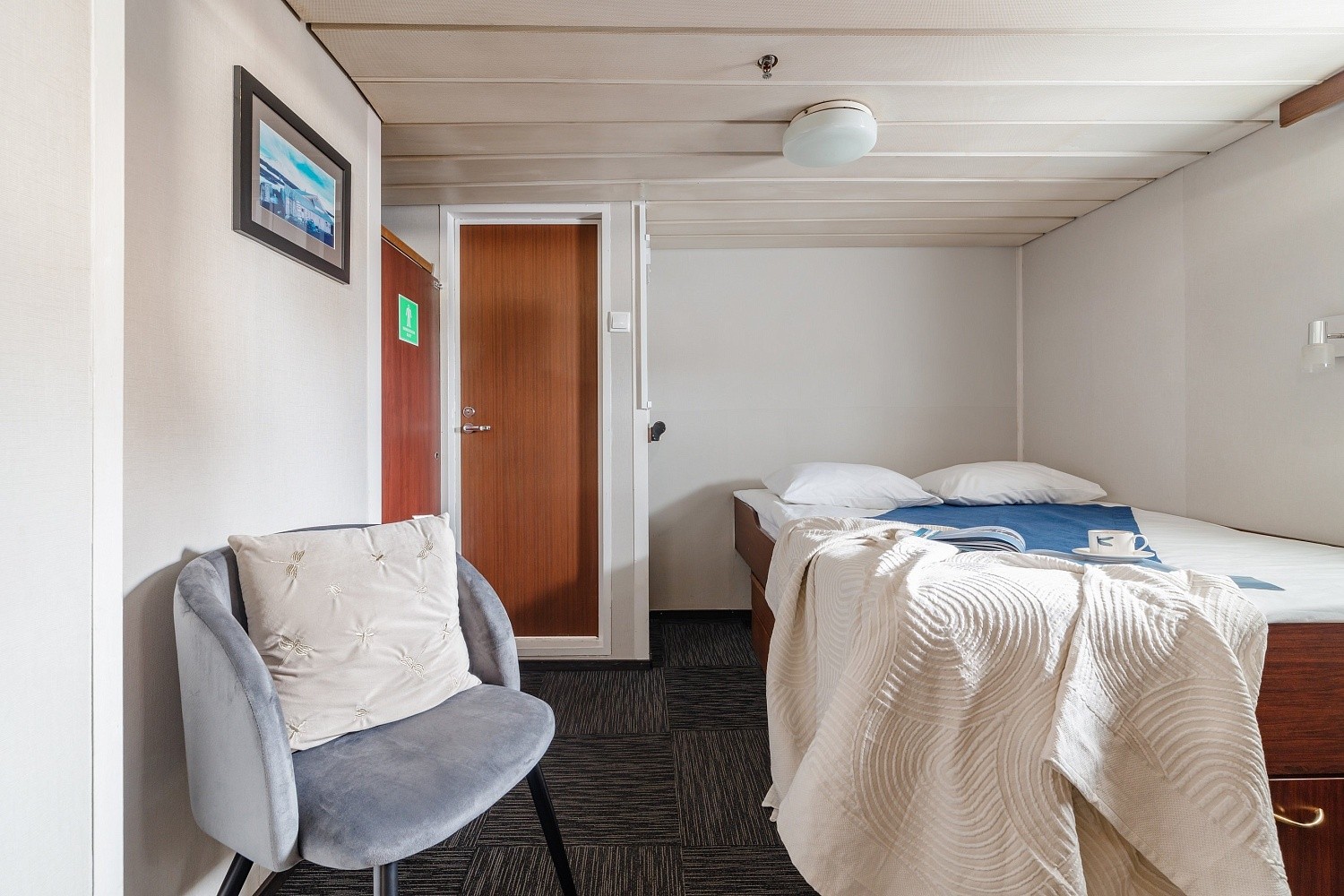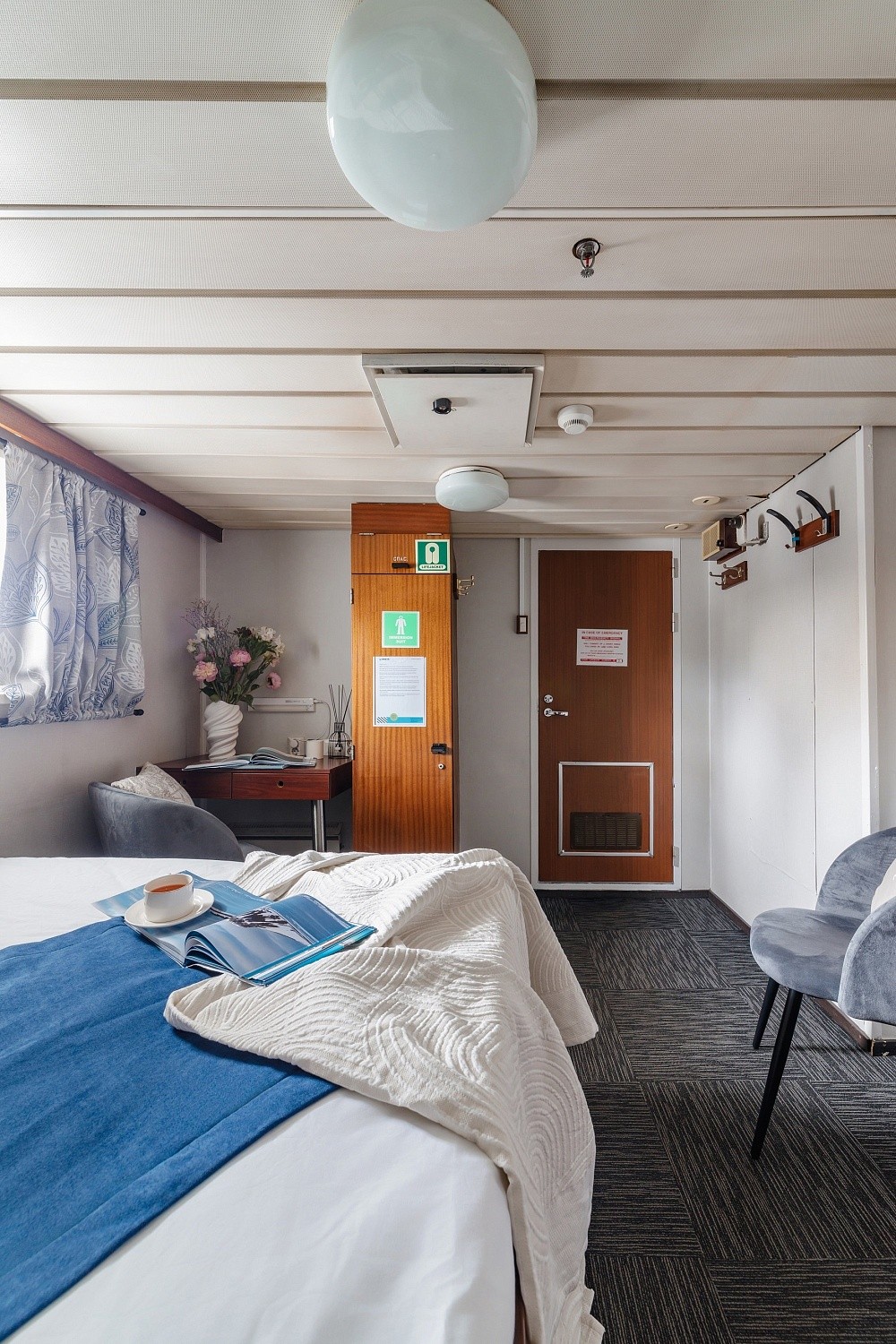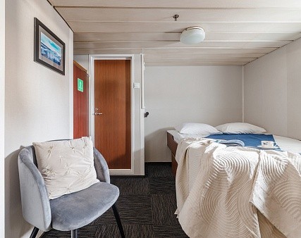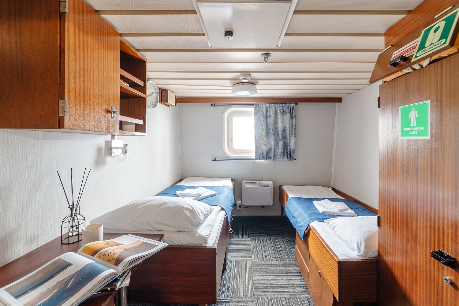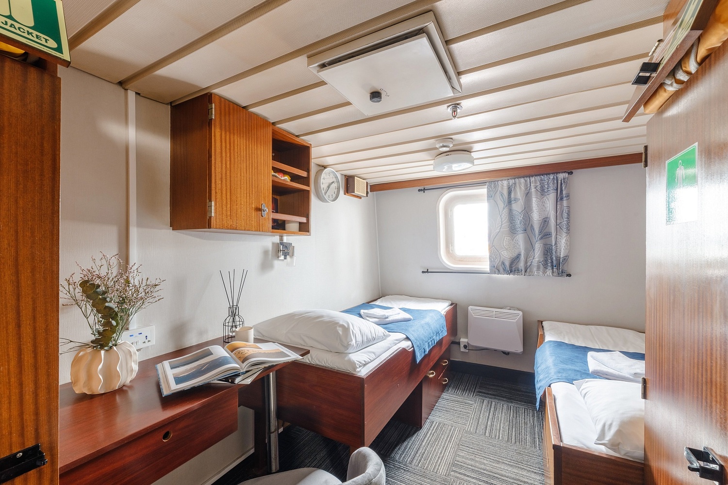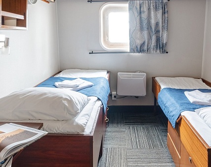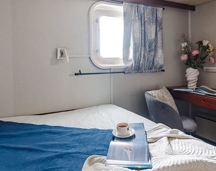 В каюте: окно, два спальных места (нижние), письменный стол, шкаф, тумбочки и собственные туалет и душ.