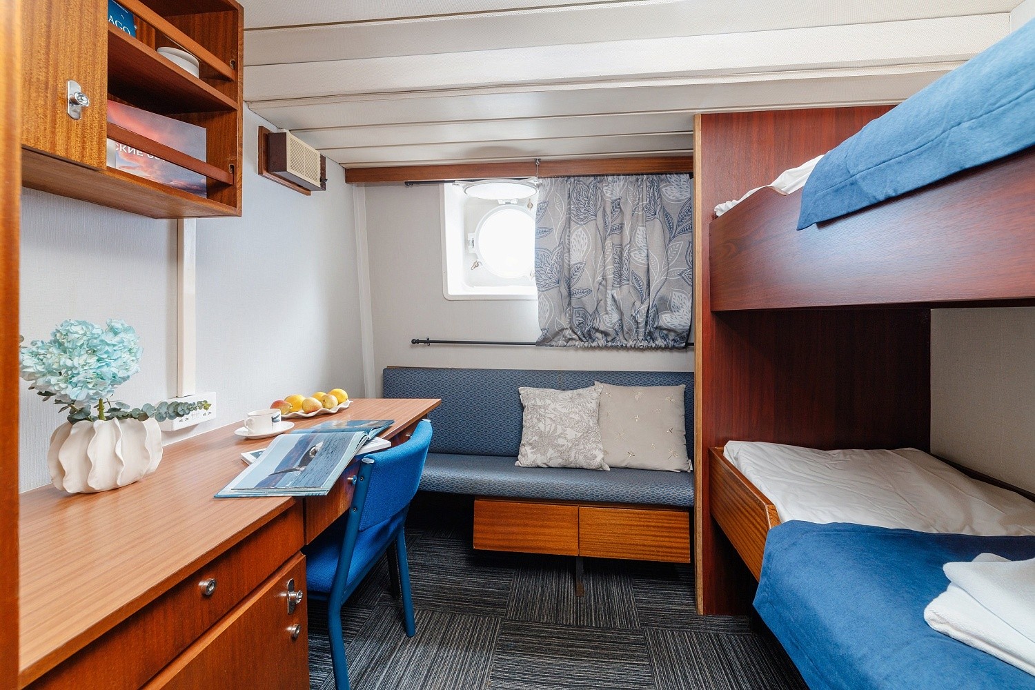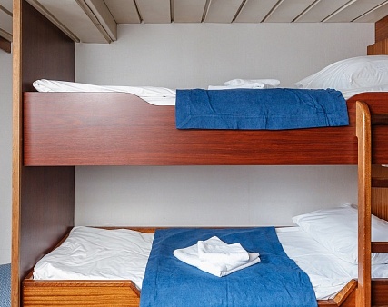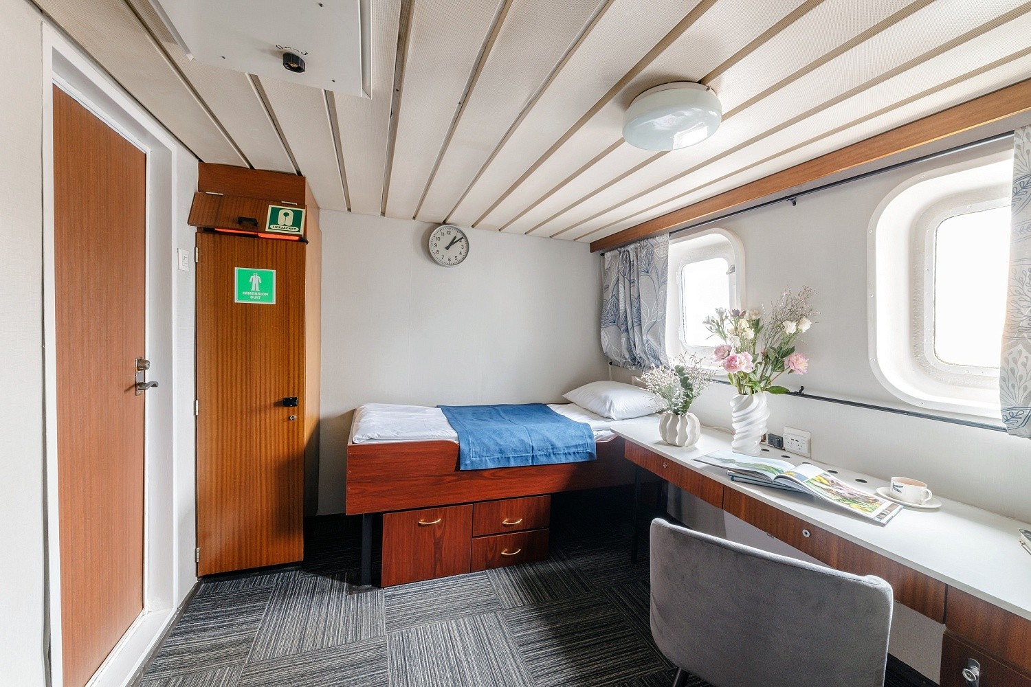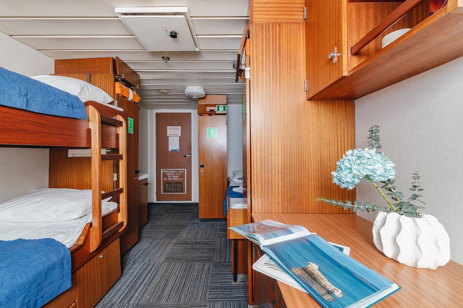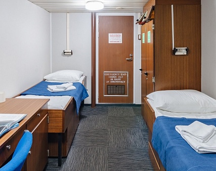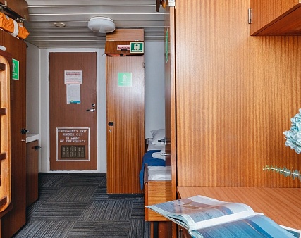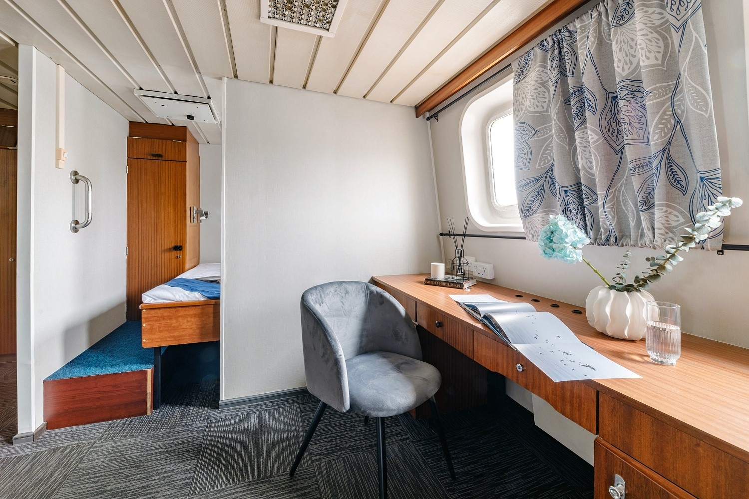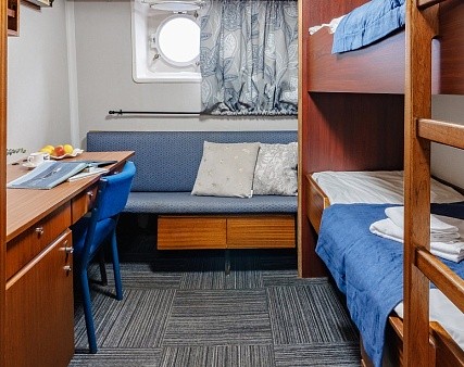 В каюте: окна, два спальных места (нижнее и верхнее), письменный стол, шкаф, тумбочки и собственные туалет и душ.