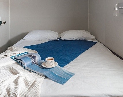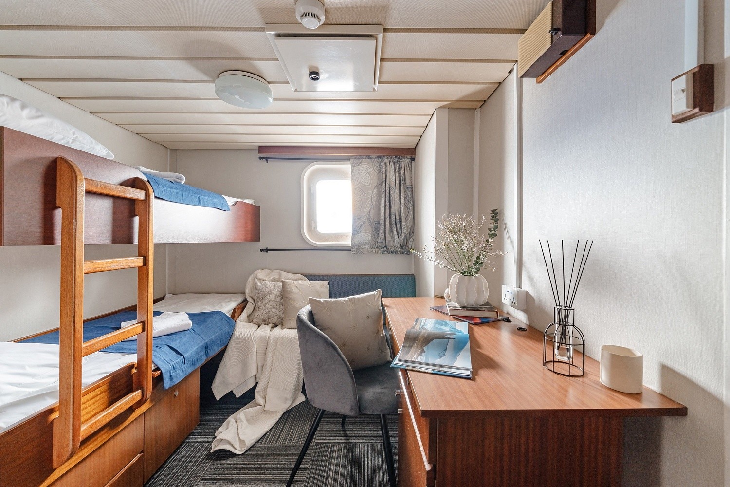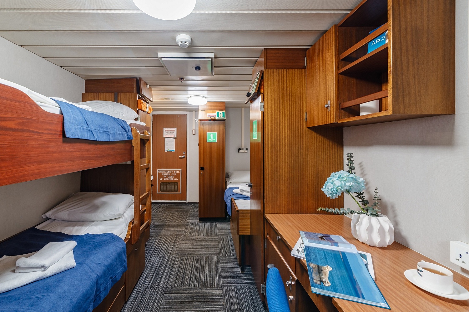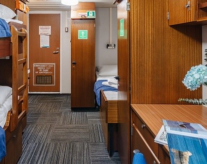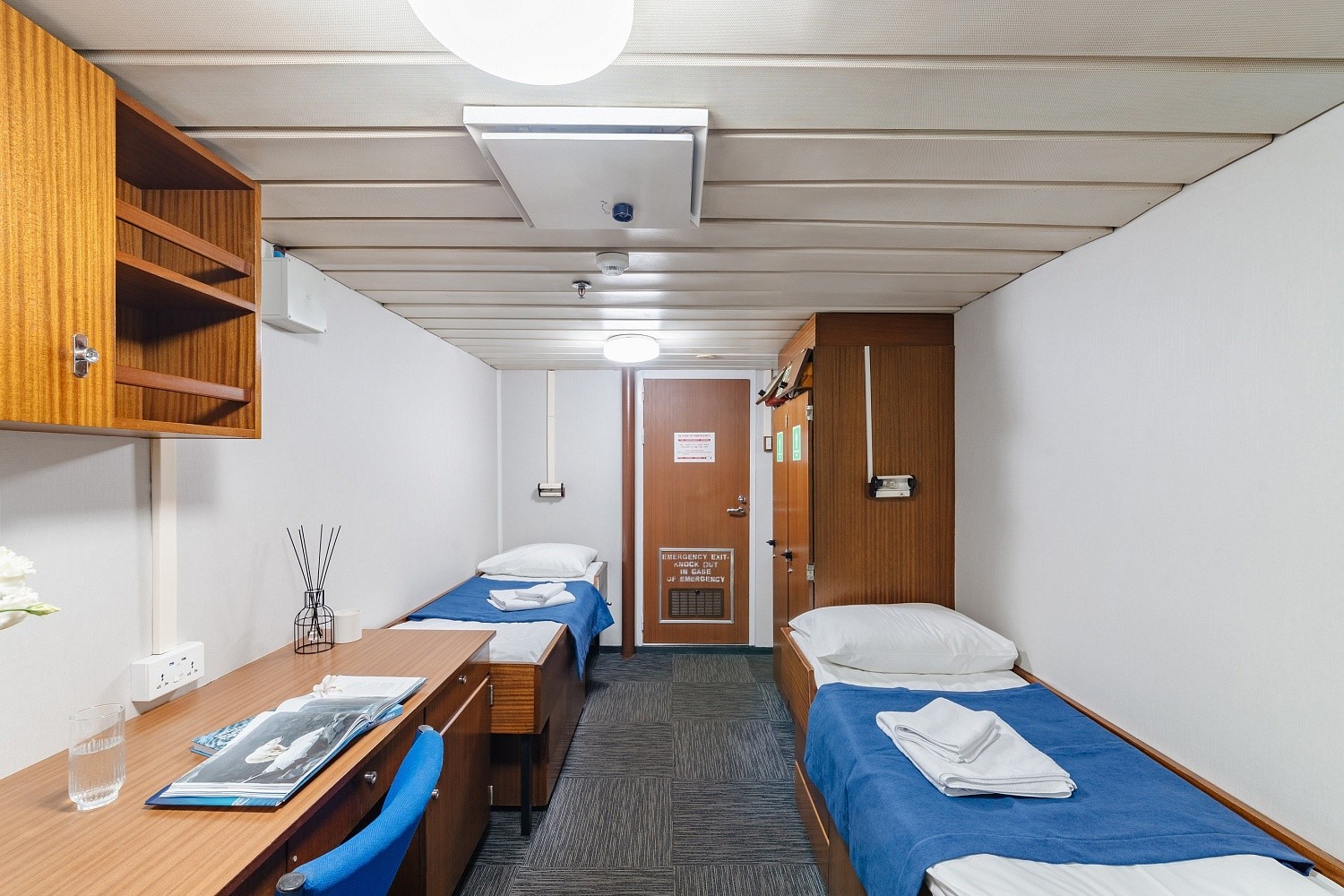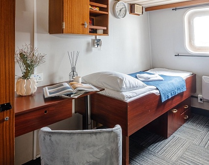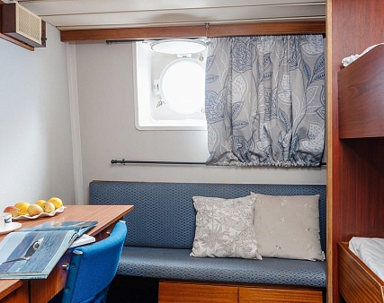 В каюте: окна, два спальных места (нижнее и верхнее), письменный стол, шкаф, тумбочки и собственные туалет и душ.
