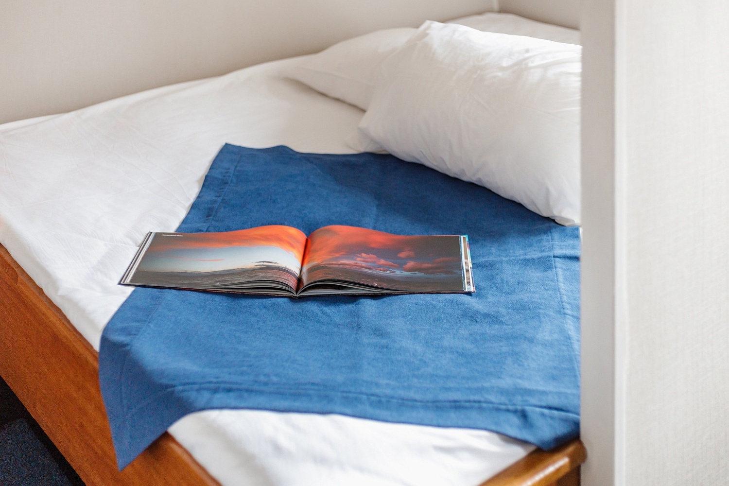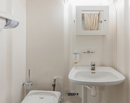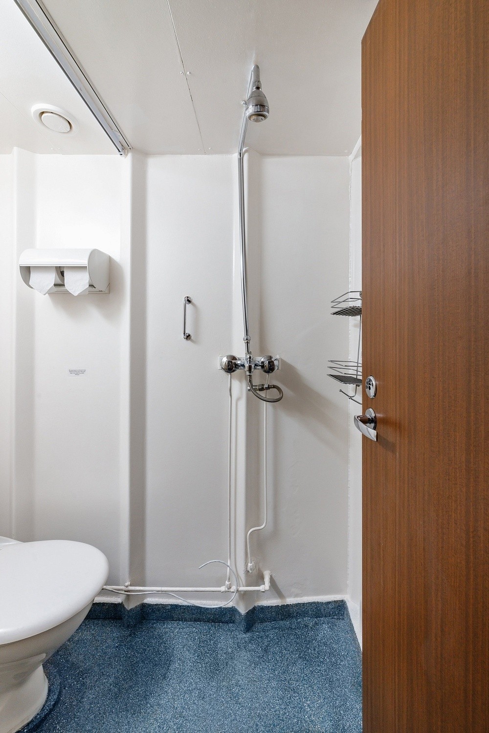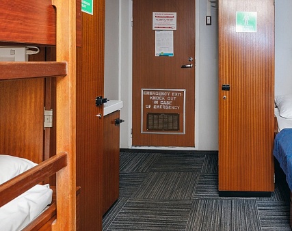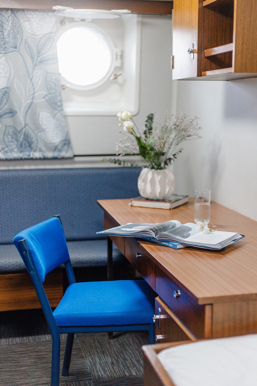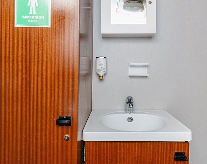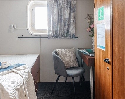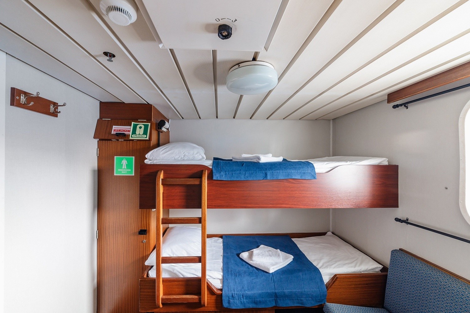 В каюте: окна, два спальных места (нижнее и верхнее), письменный стол, шкаф, тумбочки и собственные туалет и душ.