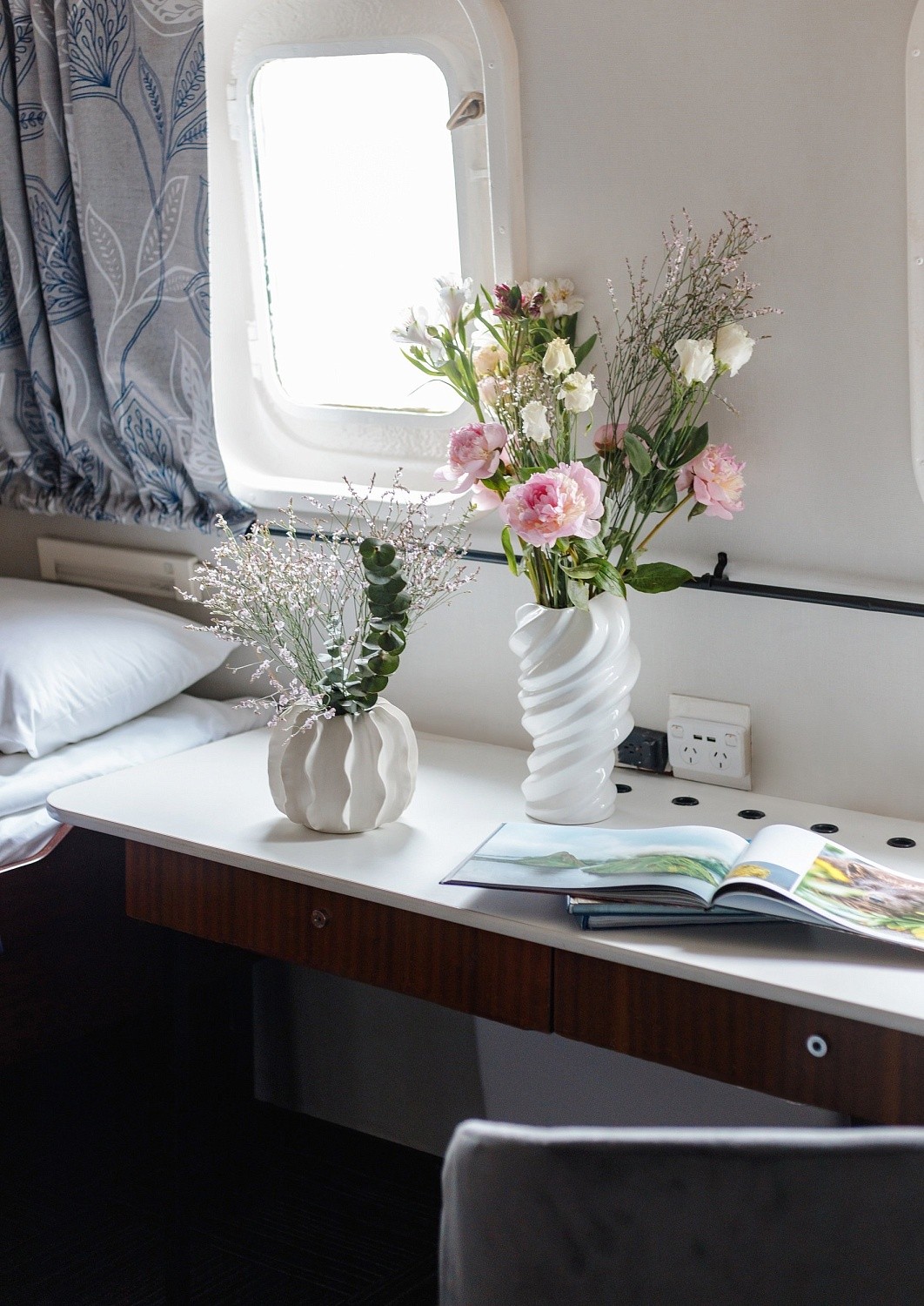 В каюте: окна на две стороны, двуспальная кровать в отдельной зоне, гостиная с диваном, письменный стол, шкаф, тумбочки и собственные туалет и душ.