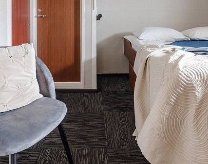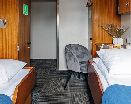 В каюте: окно, два спальных места, письменный стол, шкаф, тумбочки и умывальник (удобства совмещенные). В каюте 321 возможно размещение третьего человека на дополнительном спальном месте.