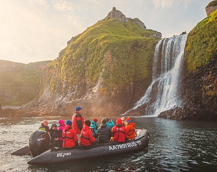 Если между островами Атласова и Анциферова провести прямую линию, то почти параллельно ей— немного юго-восточнее — будет находиться вытянутый почти на 100 км в длину остров Парамушир. Весь вчерашний день мы плыли вдоль него, а сегодня высадимся на берег в бухте Крашенинникова. Отсюда будут видны сразу несколько вулканов, но нам будет сложно отвести глаза от ближайшего — Фусса. Этот рослый красавец (выше 1,7 км над уровнем моря) имеетформу почти правильного конуса. Рядом с ним кажется, что находишься внутри ожившей японской гравюры. Мы совершим прогулку вдоль берегов Парамушира на «Зодиаках» и с воды приблизимся к гигантским птичьим базарам. Если к нам подплывёт кит или касатка, не беспокойтесь: они даже не заденут нашей лодки.