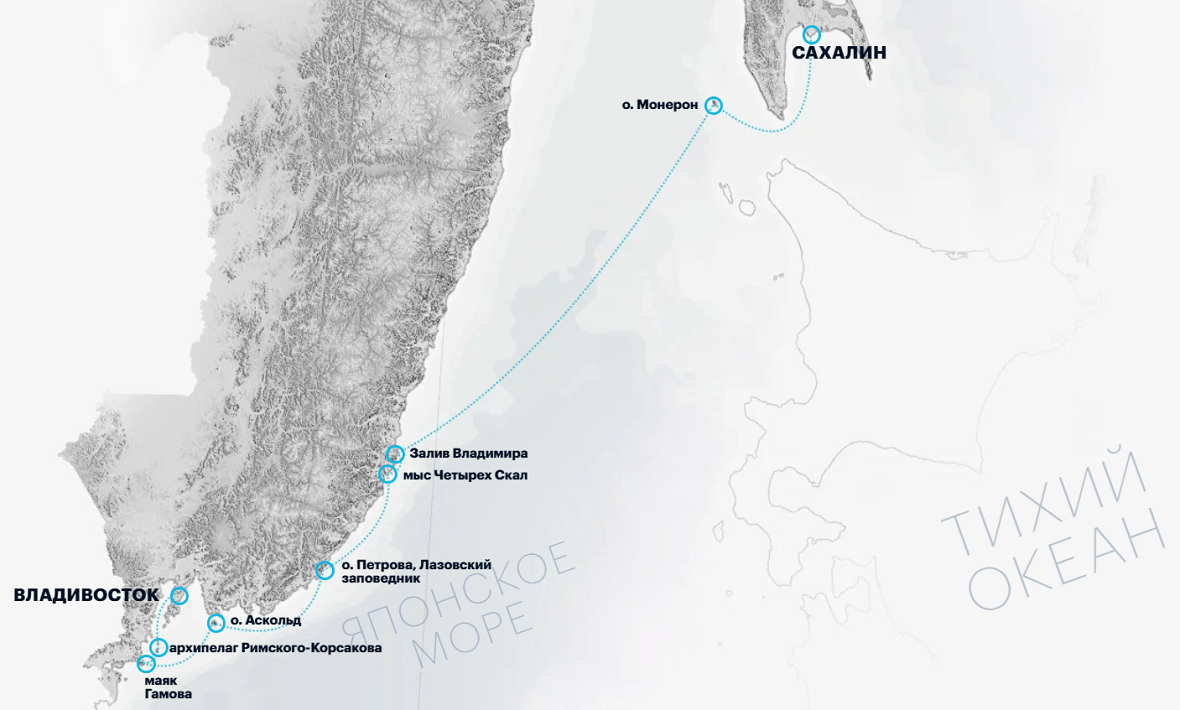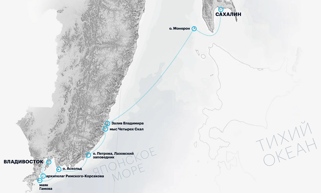 Владивосток Архипелаг Римского-КорсаковаМаяк ГамоваОстров ФуругельмаОстров АскольдОстров ПетроваБухта РуднаяОстров МонеронКорсаков (трансфер) Южно-Сахалинск