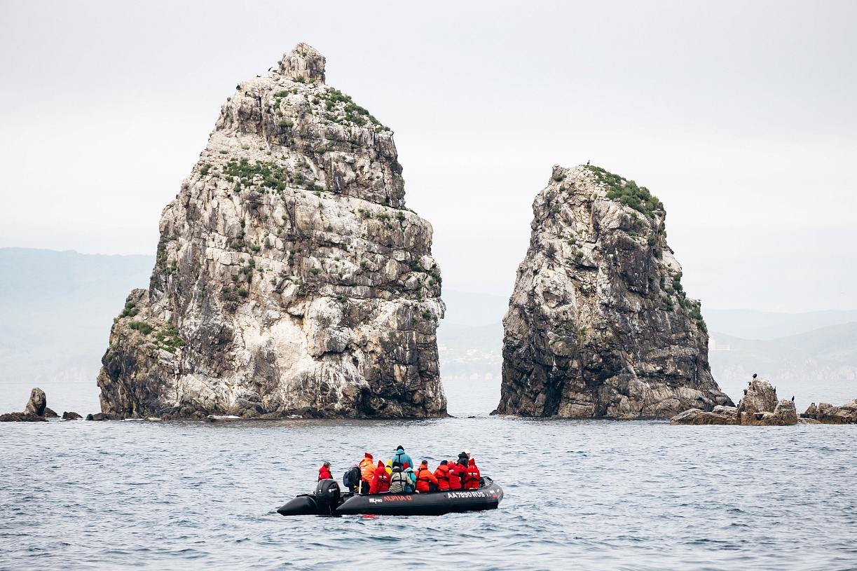 Первые два дня плывём на юго-запад. Ближайший пункт назначения — остров Большой Пелис. Географически он входит в архипелаг Римского-Корсакова (названный не в честь знаменитого композитора, а в честь его старшего брата — мореплавателя, сделавшего большой вклад в исследование дальневосточного побережья). Административно — в Дальневосточный морской заповедник, единственный в России природный резерват, почти всю площадь которого составляет акватория. Это не значит, что на берегу здесь нечего смотреть! И дело не только в завораживающих пейзажах. Из 5,5 тыс. животных и растений заповедника больше половины обитают, гнездятся и растут на суше. Опознать и оценить краснокнижные виды нам помогут сотрудники заповедника.