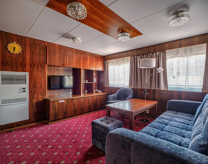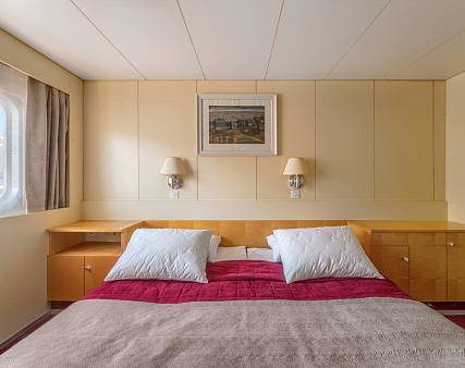 В каюте: одно спальное место, шкаф для одежды, холодильник, фен, радио, душ, санузел, кондиционер, обзорное окно, электророзетка на 220V.