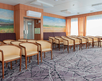 В каюте: два спальных места, шкаф для одежды, зеркало, радио, душ, санузел, кондиционер, обзорное окно, электророзетка на 220V.