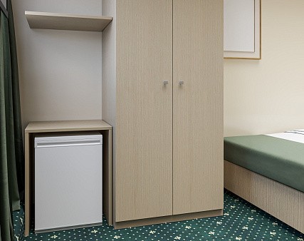 В каюте: три спальных места (два внизу, третье вторым ярусом), шкаф для одежды, зеркало, радио, фен, душ, санузел, холодильник, кондиционер, обзорное окно, электророзетка на 220V.