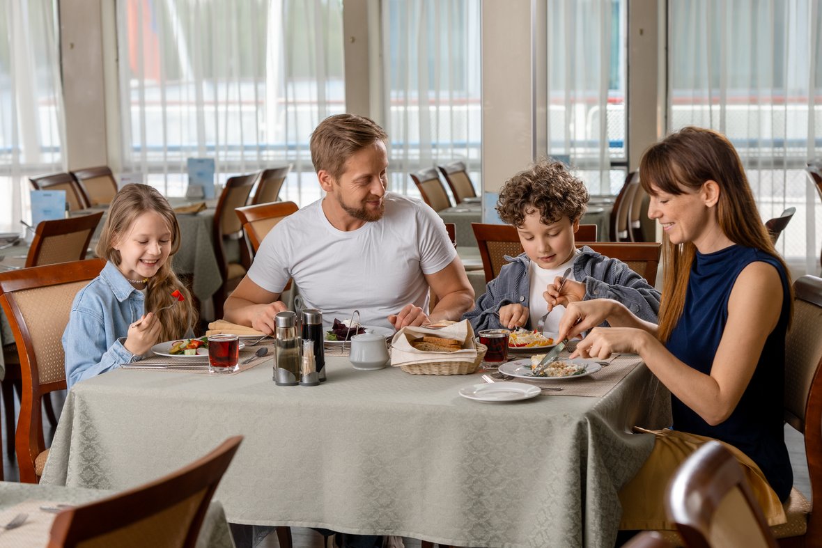 - Завтрак — шведский стол или заказная система с элементами шведского стола, фиксированная рассадка. Включённые напитки (без ограничения): вода, сок, чай, кофе. В рейсах до 4-х дней при ранней высадке в день прибытия завтрак континентальный;