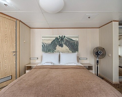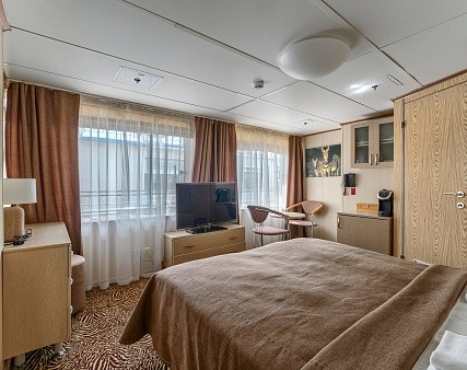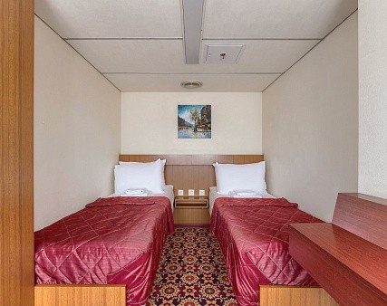 В каюте: два спальных места, не сдвигаются, шкаф для одежды, радио, центральный кондиционер, холодильник, телевизор, душ, санузел, фен, сейф, обзорное окно (в каютах, расположенных на главной палубе, после переоборудования на в 2020 году не открывается согласно технике безопасности и требованиям морского регистра), электророзетка на 220V.