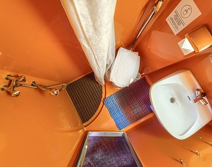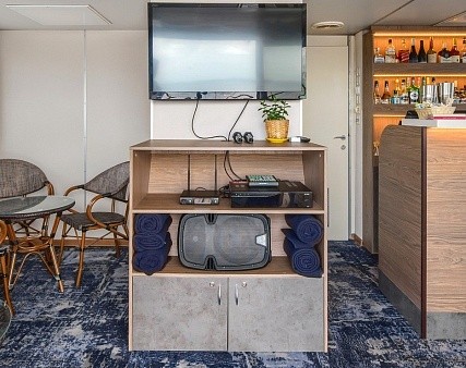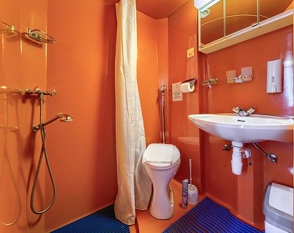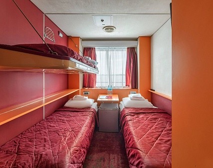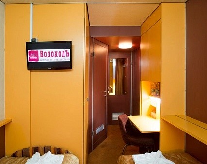 В каюте: три спальных места (два внизу и одно — вторым ярусом), шкаф для одежды, радио, центральный кондиционер, холодильник, телевизор, душ, санузел, фен, сейф, обзорное окно (после переоборудования на в 2020 году не открывается согласно технике безопасности и требованиям морского регистра), электророзетка на 220V.