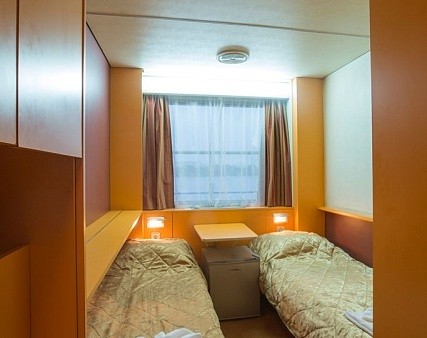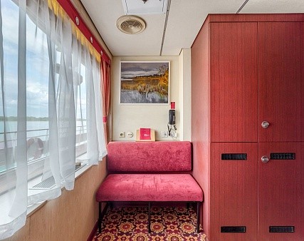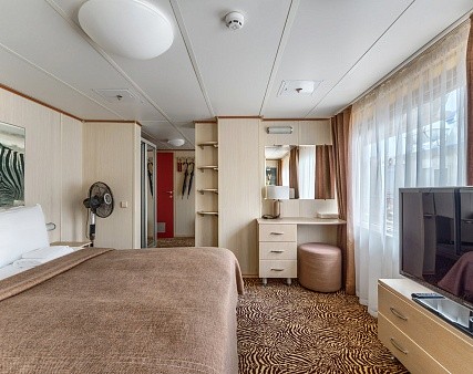 В каюте: две кровати, кровати не сдвигаются, шкаф для одежды, стол-бюро, кресло, телевизор, холодильник, радио, сейф, фен, два обзорных окна, электророзетка на 220V.