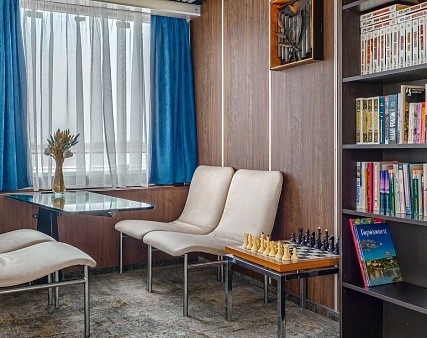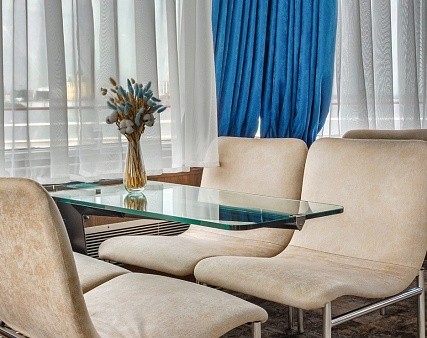 Комфортабельная просторная спальня с современным интерьером, двуспальная кровать, два кресла, кофейный столик, телевизор, холодильник, радио, фен, сейф, капсульная кофемашина, два обзорных окна, электророзетка на 220V.