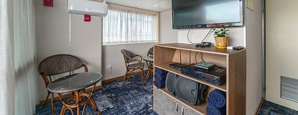 В каюте: три спальных места (два внизу и одно — вторым ярусом), шкаф для одежды, радио, центральный кондиционер, холодильник, телевизор, душ, санузел, фен, сейф, обзорное окно (после переоборудования на в 2020 году не открывается согласно технике безопасности и требованиям морского регистра), электророзетка на 220V.