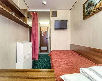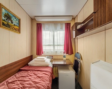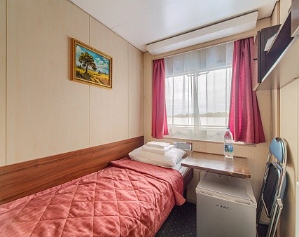 В каюте: одно спальное место, шкаф для одежды, радио, телевизор, душ, санузел, холодильник, кондиционер, обзорное окно, электророзетка на 220V, фен.