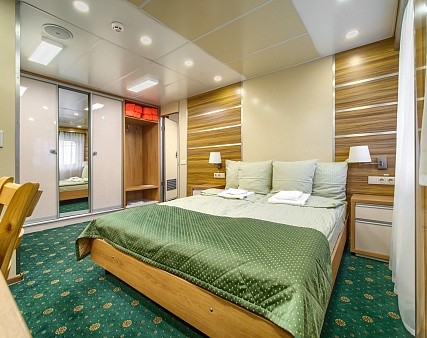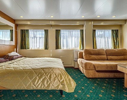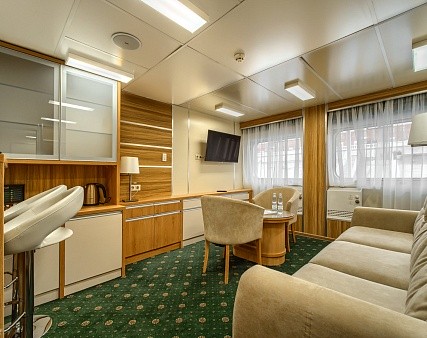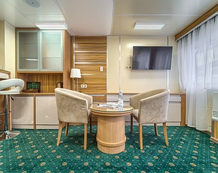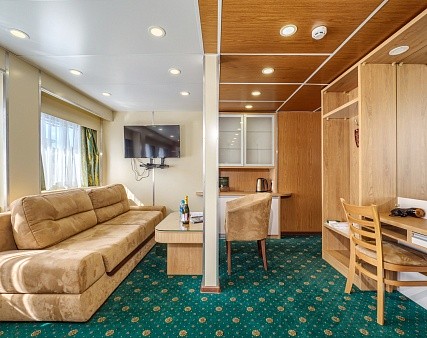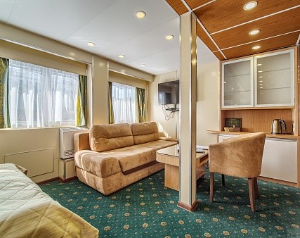 Просторная каюта с современным интерьером, мягкая мебель — диван, два кресла, двуспальная кровать, шкаф для одежды, телевизор c DVD, холодильник, радио, три обзорных окна, электророзетка на 220V, фен, кондиционер.