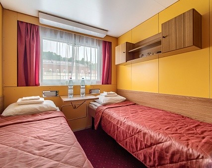 Просторная каюта с современным интерьером, четыре отдельных спальных места, шкаф для одежды, журнальный столик, телевизор c DVD, душ, санузел, холодильник, радио, два обзорных окна, электророзетка на 220V, фен.