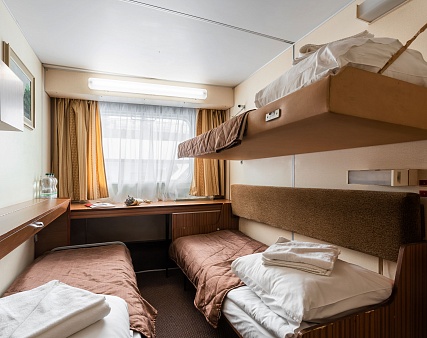 В каюте: три спальных места (два внизу, одно вторым ярусом), шкаф для одежды, трюмо, радио, душ, санузел, кондиционер, обзорное окно, электророзетка на 220V.