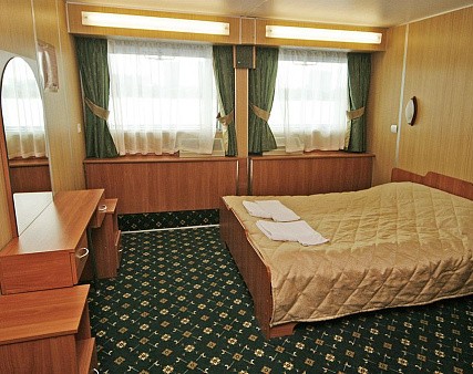 В каюте: два спальных места, шкаф для одежды, трюмо, радио, душ, санузел, кондиционер, обзорное окно, электророзетка на 220V.