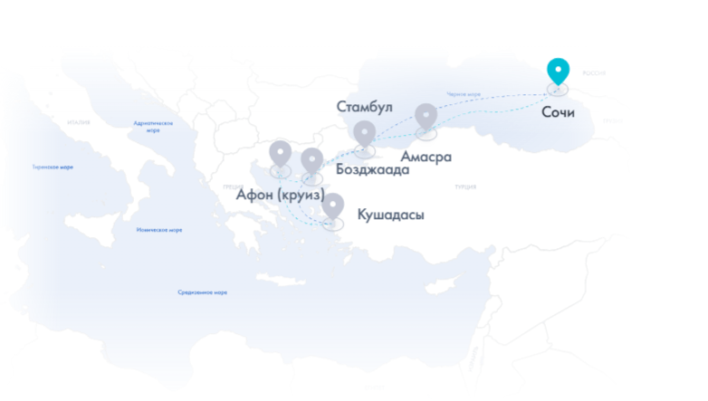 СочиДень в мореСтамбул (2 дня)КушадасыАфон (круиз)БозджаадаДень в мореАмасраДень в мореСочи