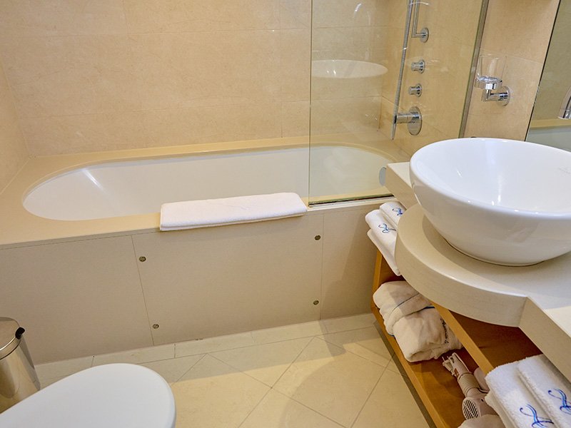 В каюте: кровать и диван (расположены буквой Г), кондиционер, гардероб, телевизор, телефон, фен, сейф, халаты, увлажнитель воздуха. Ванная комната с душем и туалетом.
