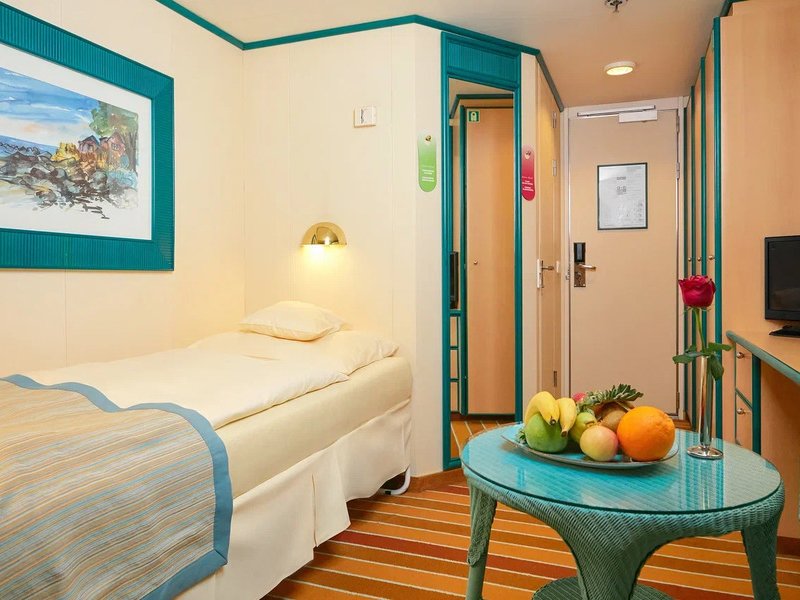 В каюте: окно с загороженным видом (шлюпкой или конструкцией лайнера), две односпальные кровати, кондиционер, гардероб, телевизор, телефон, фен, сейф, халаты, увлажнитель воздуха. Ванная комната с душем и туалетом.