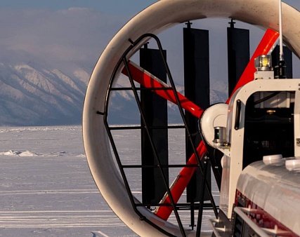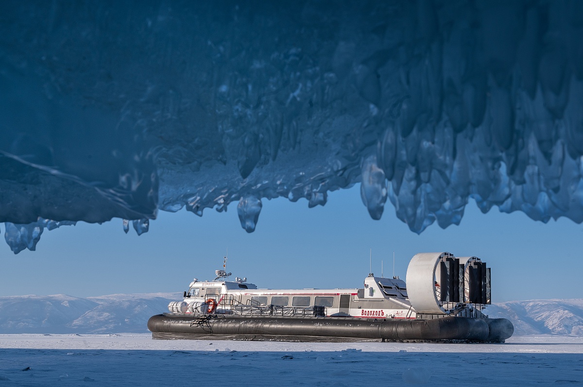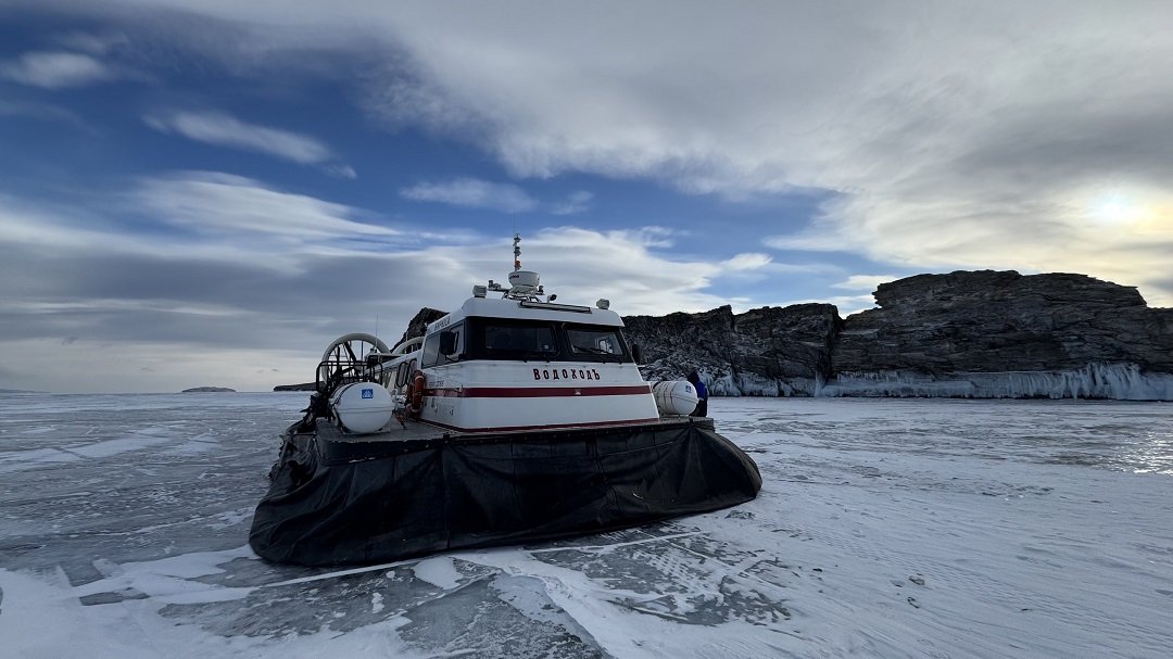 Переход на СВП по бухтам с самым красивым льдом. Здесь ветра обнажили обширный участок того самого волшебного льда с пузырьками и трещинами, которым знаменит Байкал в зимний период.