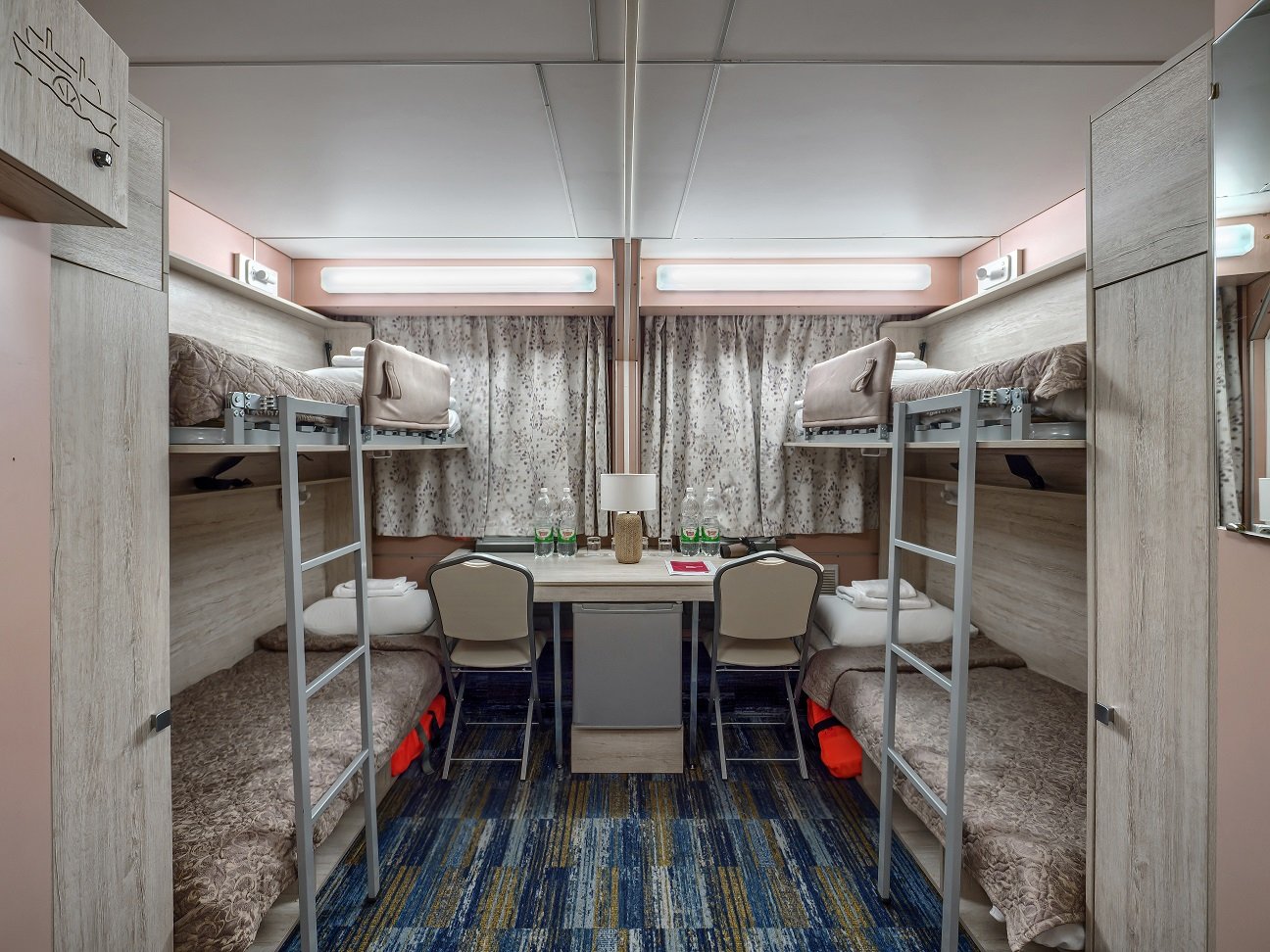 В каюте: четыре спальных места (два внизу, два вторым ярусом), шкаф для одежды, радио, душ, 2 санузла, холодильник, кондиционер, два обзорных окна, электророзетка 220V, фен.