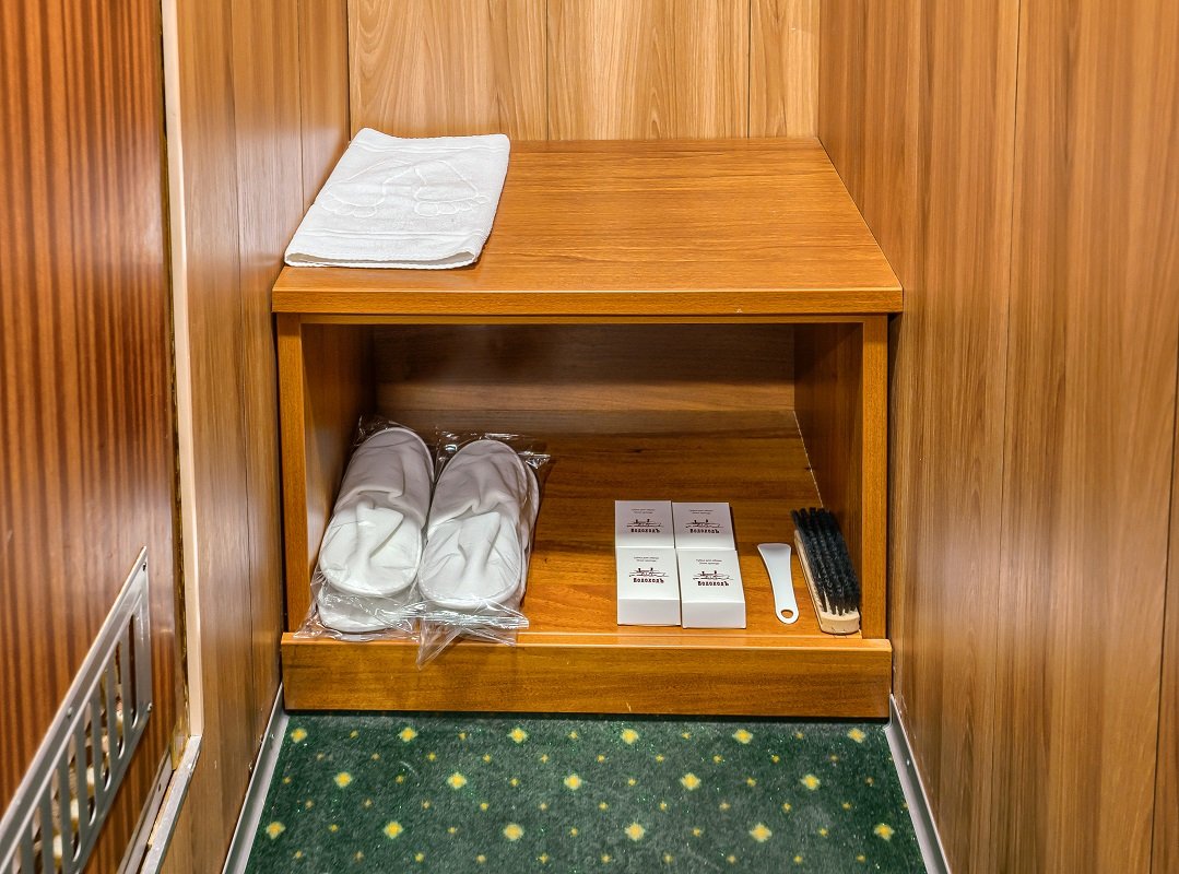 В каюте: два спальных места (одно над другим), шкаф для одежды, радио, душ, санузел, кондиционер, обзорное окно, электророзетка 220V, фен.