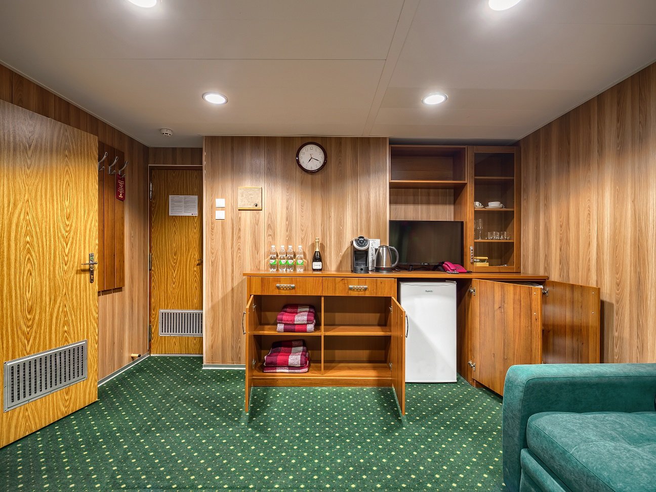 В гостиной: мягкая мебель (кресло, диван — раскладывающийся на двух человек), телевизор, холодильник, чайник, кондиционер, телефон (внутрисудовой), радио, два обзорных окна, электророзетка на 220V.