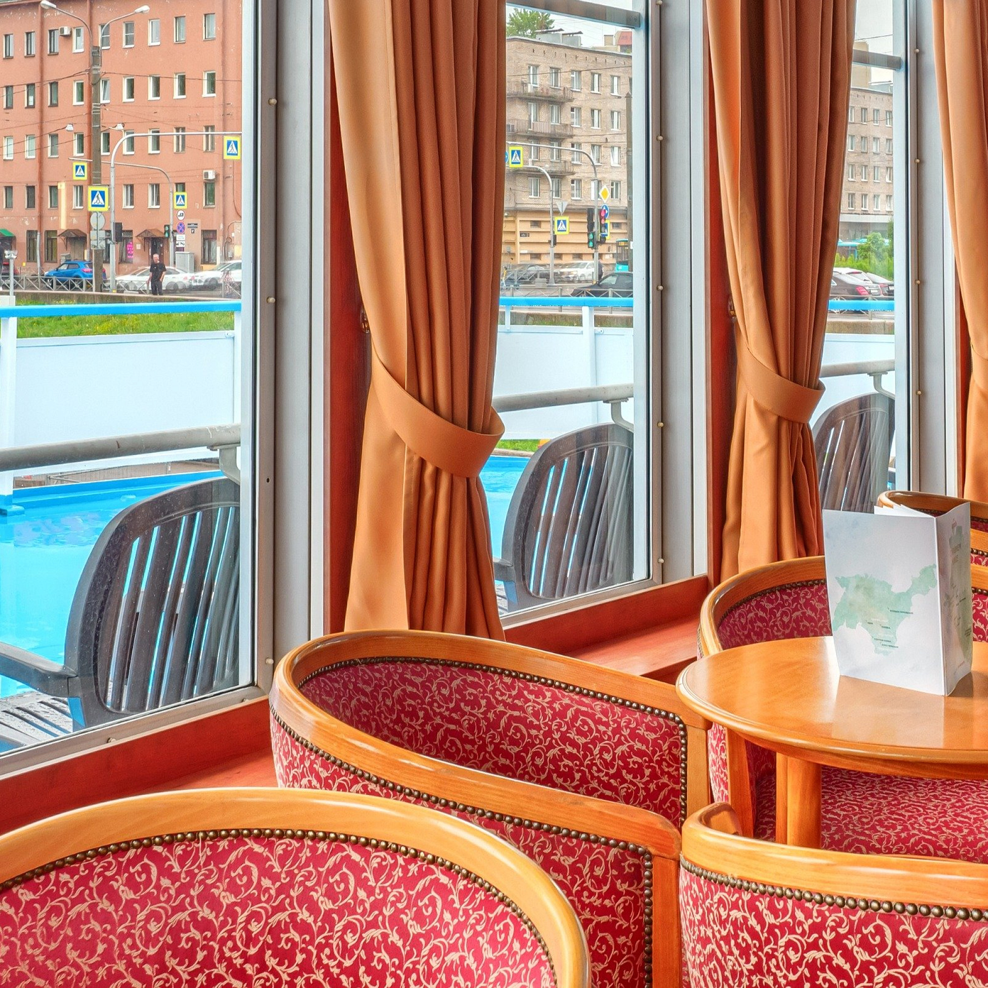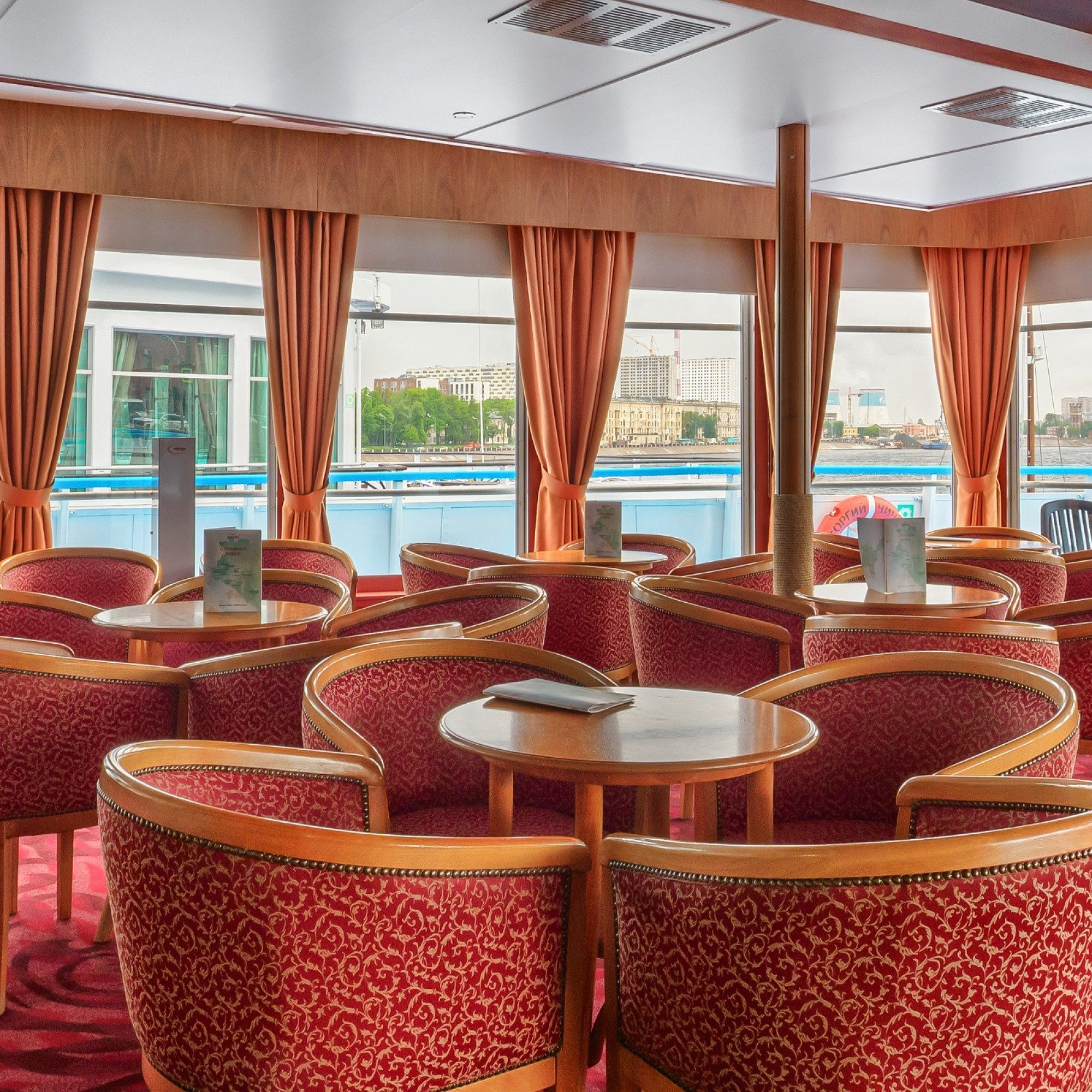 - Ужин — заказная система питания (выбор блюд со 2-го дня круиза). Включённые напитки (без ограничения): вода, чай, кофе, кисломолочный напиток (1 стакан 200 мл на ужин по запросу гостя). На выбор: вино красное / белое / игристое (1 бокал, 125 мл) / водка (1 рюмка, 50 мл) / пиво (1 бокал, 300 мл), домашний морс (1 бокал, 200 мл);