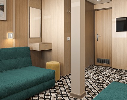 Двухкомнатный на средней палубе. Номер каюты: 119. Двухкомнатная каюта с удобствами (душ, санузел, кондиционер). Каюта рассчитана на размещение от двух до четырех человек. В гостиной: шкаф-стенка, двухместная кровать, телевизор, холодильник, радио, фен, два обзорных окна, электророзетка на 220V. В спальне: два спальных места (одно над другим), зеркало.