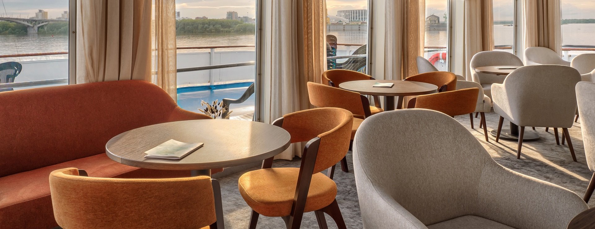В каюте: одно спальное место, шкаф для одежды, радио, телевизор, холодильник, сейф, фен, душ, санузел, кондиционер, обзорное окно, электророзетка на 220V.
